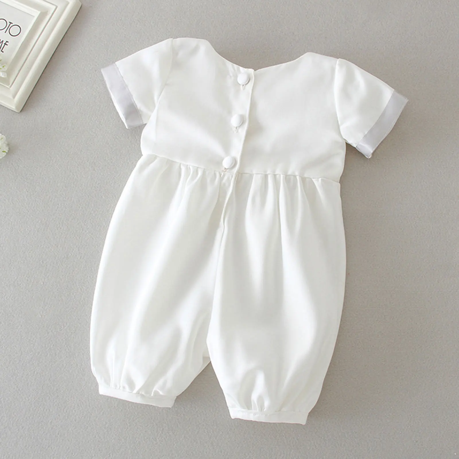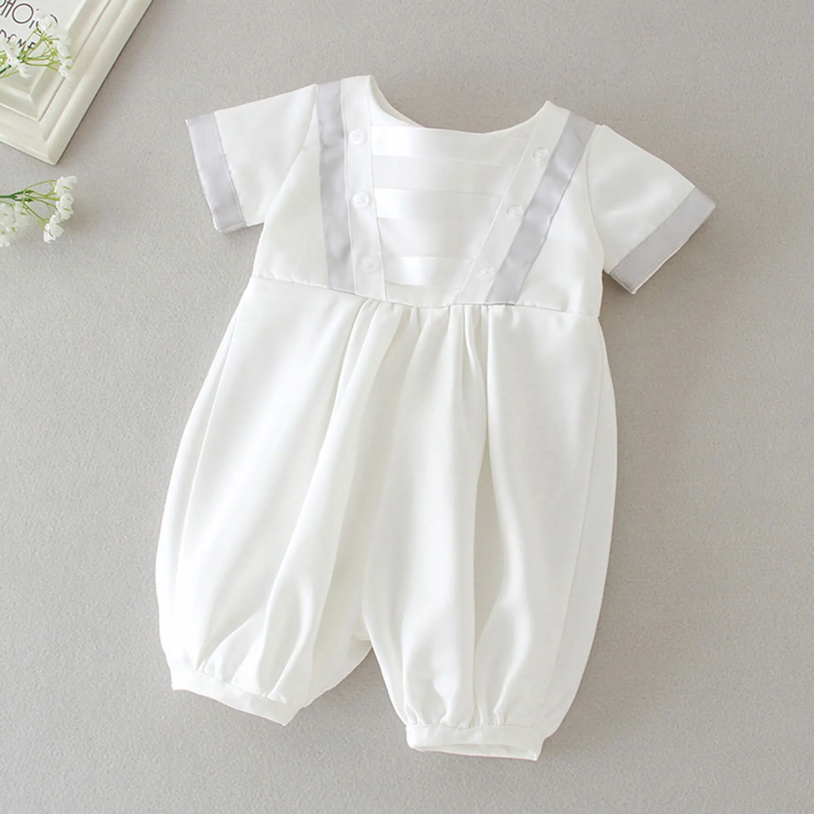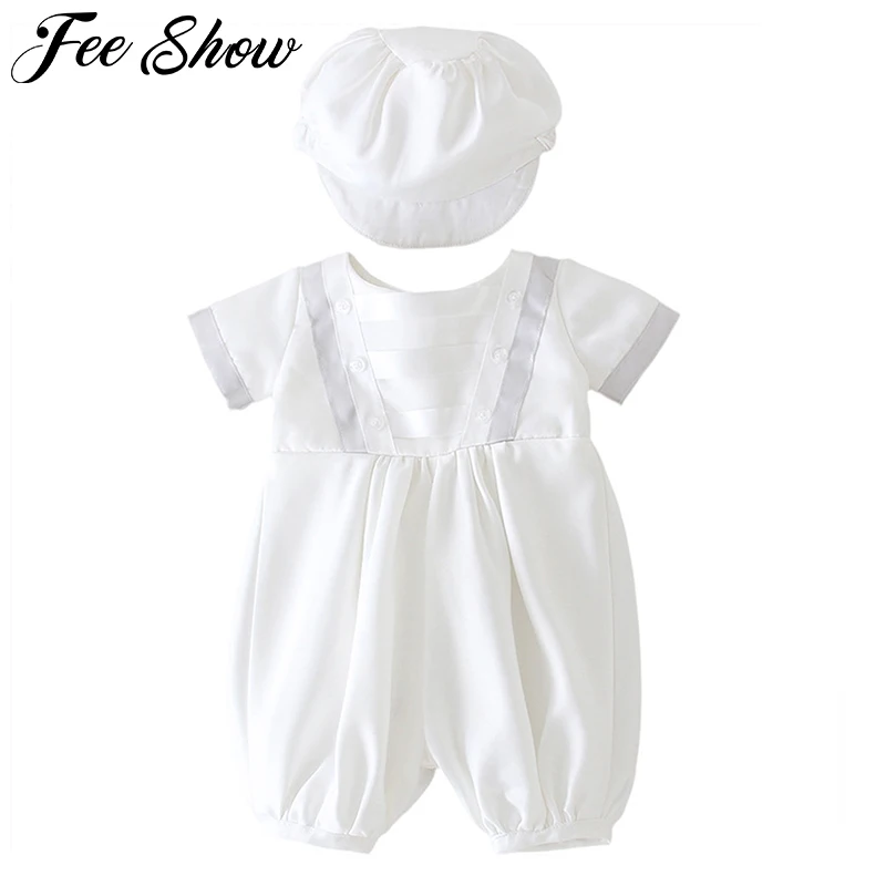 Особенности: Очаровательный белый Крестильный комбинезон для маленьких мальчиков и Кепка newsboy. Короткие рукава, круглый воротник, подтяжки на нижней части комбинезона, белые и серые полоски спереди и 6 пуговиц украшают грудь. Сочетающаяся с белой кепкой newsboy, как невинный ангел, приземляющийся на мир. Кнопки сзади, легко надевать и снимать. Подходит для дня рождения полной луны, вечерние, свадебные, торжественные или другие особые случаи.