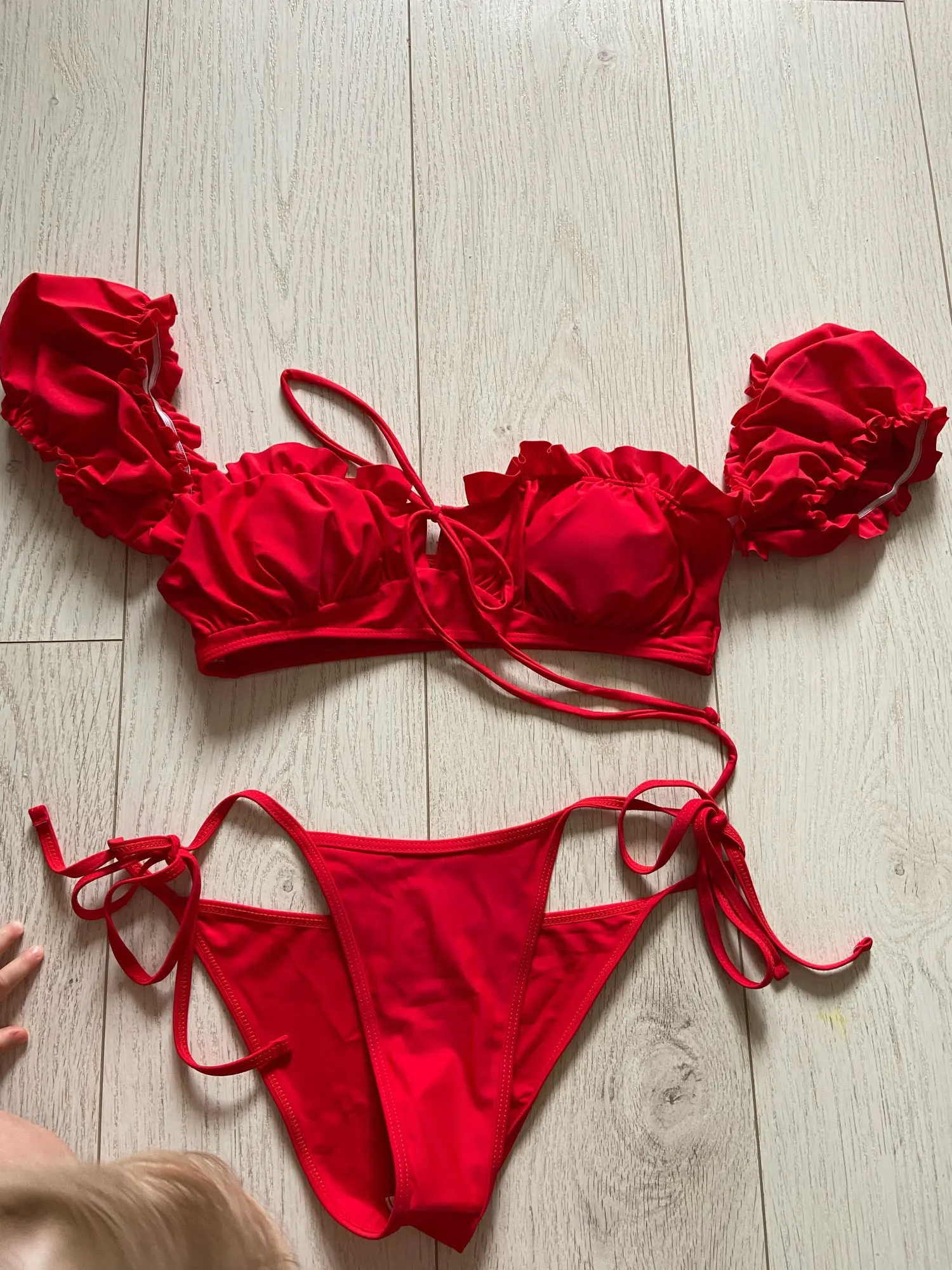 Сексуальное бикини 2021, Женский однотонный красный бюстгальтер пуш-ап с коротким рукавом и вырезами, купальный костюм, бандажные стринги, купальная одежда, пляжная одежда