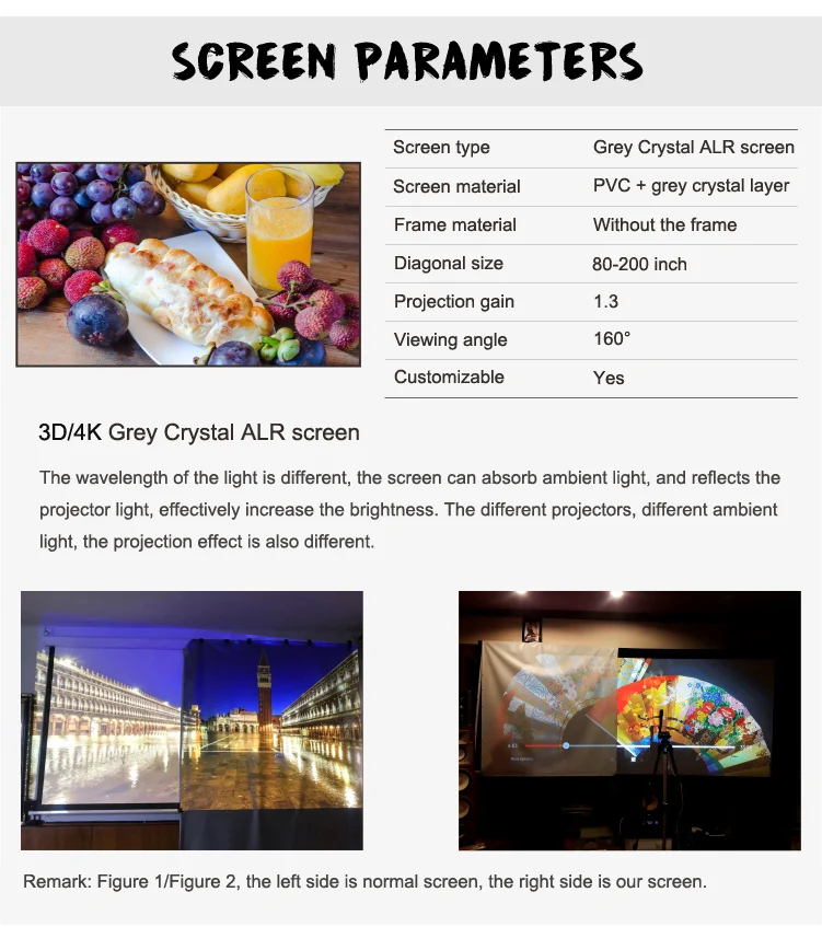 TIPS1: Этот экран ALR подходит для короткого проектора (фокусное расстояние более1,5 м), Проектор средней и длинной фокусировки. Если ваш проектор (ультра) короткий проектор (фокусное расстояние меньше, чем1,5 м), Пожалуйста, оставьте нам сообщение, мы сделаем для вас специальный материал поверхности.
