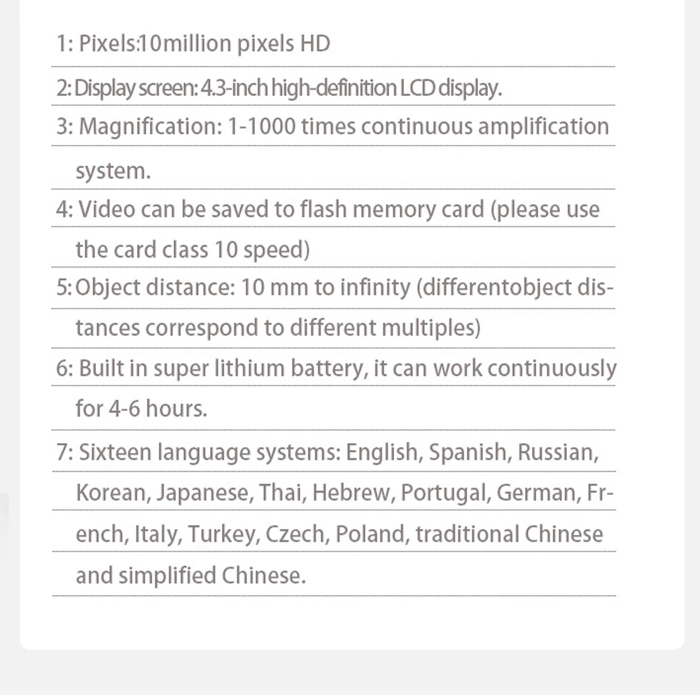 1,3-дюймовый ЖК-экран G1000 микроскоп, кронштейн можно поворачивать в соответствии с вашими потребностями, в то время как объектив поддерживает непрерывное увеличение в 1-4,3 раз. Это определенно станет прекрасным помощником для вашей повседневной работы.Особенности:Это цифровой микроскоп с непрерывным увеличением и имеет широкий спектр наблюдений. Увеличение в 1-1000 раз, вы всегда можете найти подходящее множество, чтобы увидеть объект.Увеличение: от 1 до 1000 раз система непрерывного усиления.Видео можно сохранять на флеш-карту памяти (карта в комплект не входит).Расстояние до объекта: от 10 мм до бесконечности (различные расстояния объектов соответствуют разным кратным).Встроенная литиевая батарея может работать непрерывно 4-6 часов.Шестнадцать языковых систем: английский, испанский, русский, корейский, японский, тайский, иврит, Португалия, немецкий, французский, Италия, Турция, чешский, Польша, традиционный китайский и упрощенный китайский.Подходит для широкого спектра отраслей промышленности: контроль качества на различных фабриках, учебные пособия по различным предметам, наблюдение за кожей и волосами, развитие интересов и увлечений детей, идентификация ювелирных изделий и бриллиантов, печатных плат, точная фурнитура, биология, минералы, печать, ткань, античный.Этот продукт был улучшен при проблеме высокого отражения, это цифровой микроскоп, который может регулировать угол.Эта машина оснащена 8 яркими светодиодными лампами.Характеристики:Материал: АБС-пластик + металлЦвет: черный + серебристыйМатериал кронштейна: Алюминиевый пластик, металл (опционально)Пиксели: 8 миллионов пикселейЭкран дисплея: 2,8-дюймовый ЖК-дисплейУвеличение: система непрерывного усиления в 1-1000 разВидео можно сохранять на флеш-карту памяти (пожалуйста, используйте карту класса 10, карта не входит в комплект).Расстояние до объекта: от 10 мм до бесконечности (различные расстояния объектов соответствуют разным кратным.)Аккумулятор: 1 * литиевый аккумулятор, 2500 мАч (входит в комплект)Время работы: 4-6 часовВремя зарядки: 6-8 часовШестнадцать языковых систем: английский, испанский, русский, корейский, японский, тайский, иврит, Португалия, немецкий, французский, Италия, Турция, чешский, Польша, традиционный китайский и упрощенный китайский.Количество светодиодных лампочек: 8 ярких светодиодных лампочекПосылка: 210*170*90 мм/8,3*6,7 * 3.5inВес посылка: 725 г/фунтаДетали работы машины:Качество изображения: 1 м, 2 м, 3 м, 5 м, 6 м, 8 мЦиклическая Съемка камеры: 3 минуты, 5 минут, 10 минутБаланс белого: автоматический, солнечный свет, облачно, лампа накаливания из вольфрама, люминесцентная лампаКомпенсация экспозиции: 2 + 1 + 0 -1 -2Метка времени: вкл/выклУстановка времени: год, месяц и деньАвтоматическое отключение: Выкл., 3 минуты, 5 минут, 10 минутЯзык: английский, испанский, русский, корейский, японский, тайский, иврит, Португалия, немецкий, французский, Италия, Турция, чешский, Польша, традиционный китайский, упрощенный китайскийЧастота переменного тока: 50 Гц/60 ГцАвтоматическое выключение экрана: Выкл., 3 минуты, 5 минут, 10 минутФормат: ок, отменаСброс системы: да/нетУпаковочный лист:1 Микроскоп G10001 * кронштейн1 кабель для передачи данных1 * Руководство пользователя