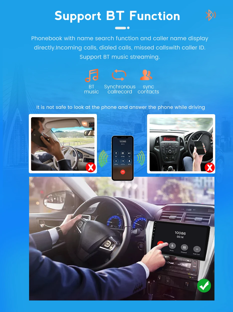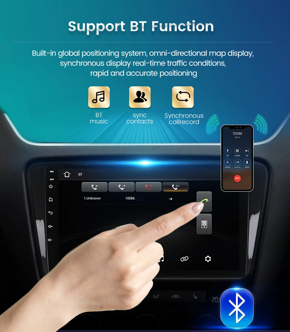 Телефонная книга с функцией поиска имени и отображением имени звонящего напрямую. Входящие звонки, звонки, пропущенные звонки с идентификатором звонящего. Поддержка потоковой передачи музыки BT.