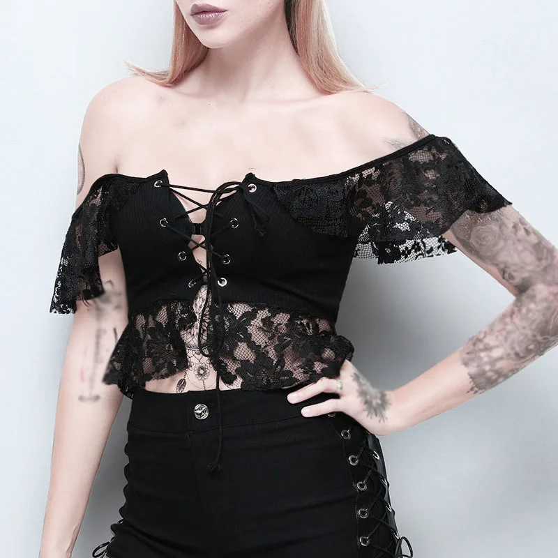 Черный Гот эстетическое футболка для женщин на шнуровке; Квадратный поло с воротником и короткими рукавами, одежда для улицы тонкий Y2K темно Академии Стиль Mall гот топы, футболки