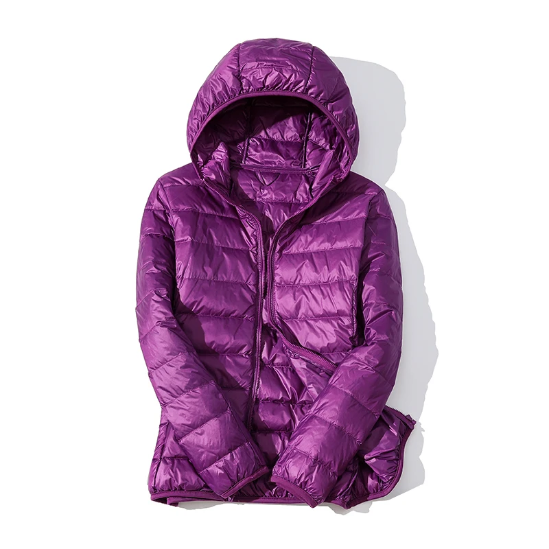 Пуховик женский ультралегкий, тонкий пуховик с капюшоном на белом у...