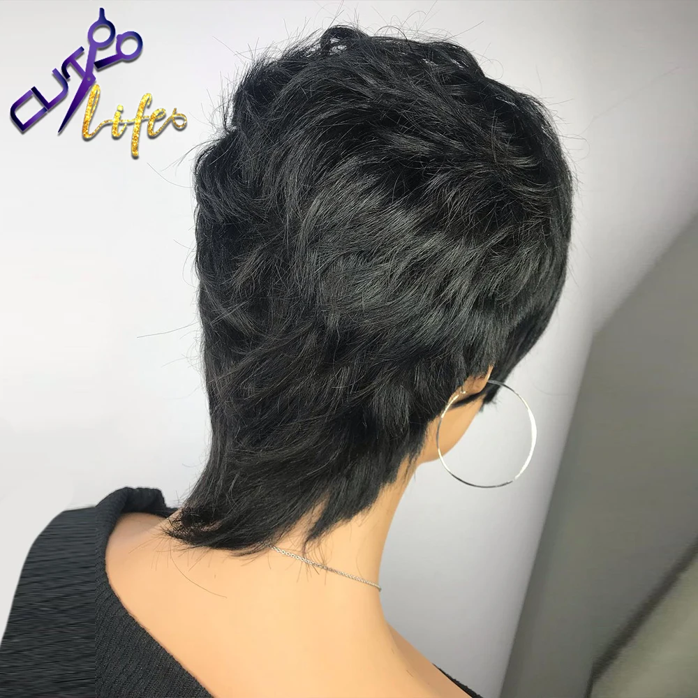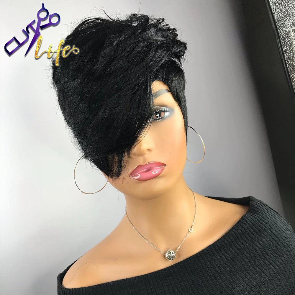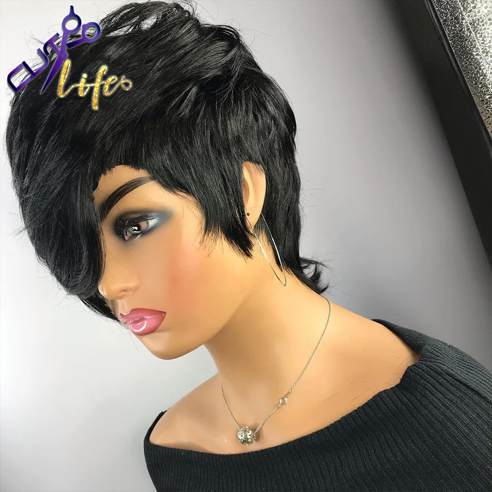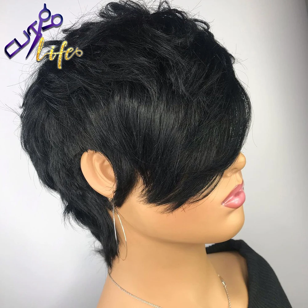 Парики из натуральных коротких волнистых волос, стрижка Боб, пикси, машинное изготовление, без шнуровки, с челкой, для чернокожих женщин, бразильские волосы без повреждений