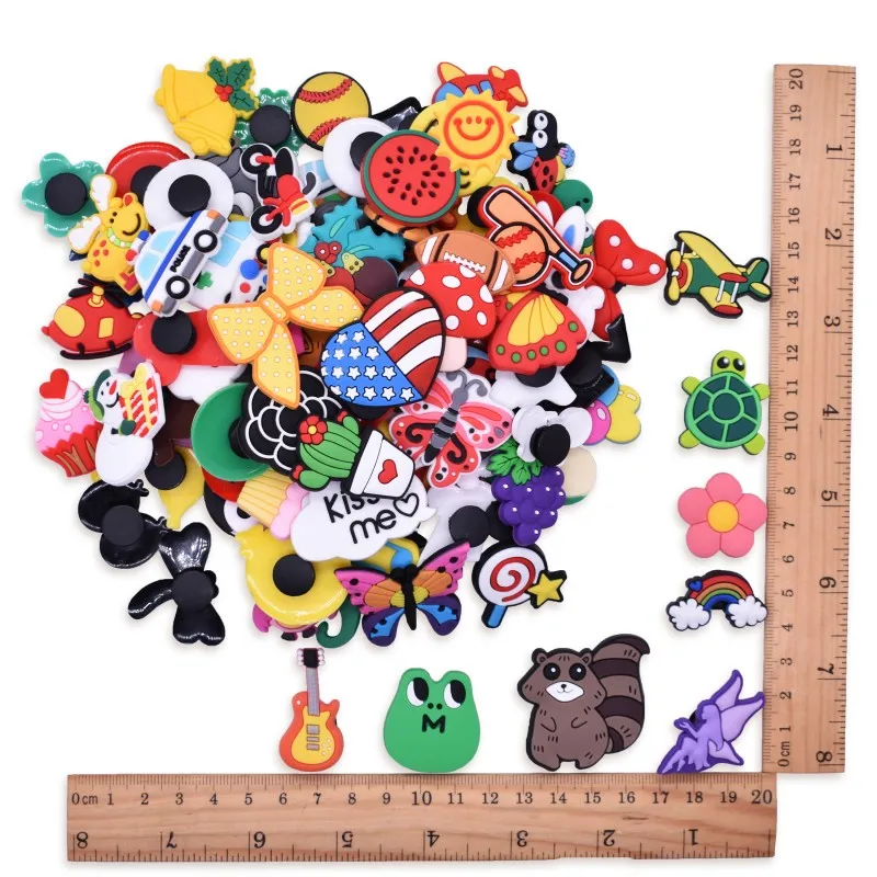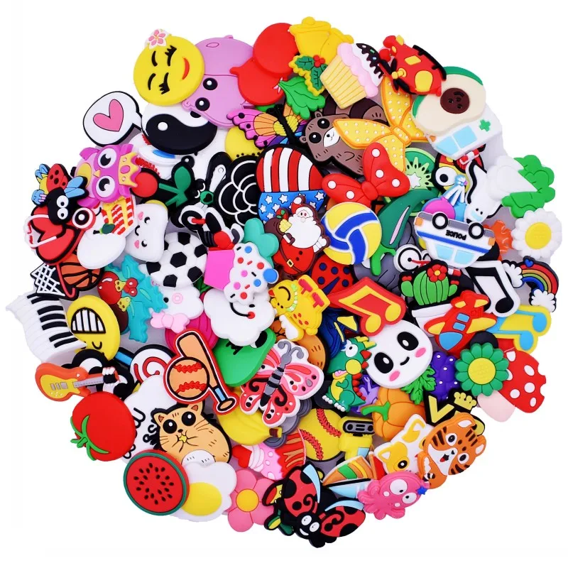 100 шт. шарики для мальчиков, для детей, девочек, животные, фрукты, цветы, пирожные, музыкальные символы, различные отверстия, сабо, мюли, украшения, дешевый подарок
