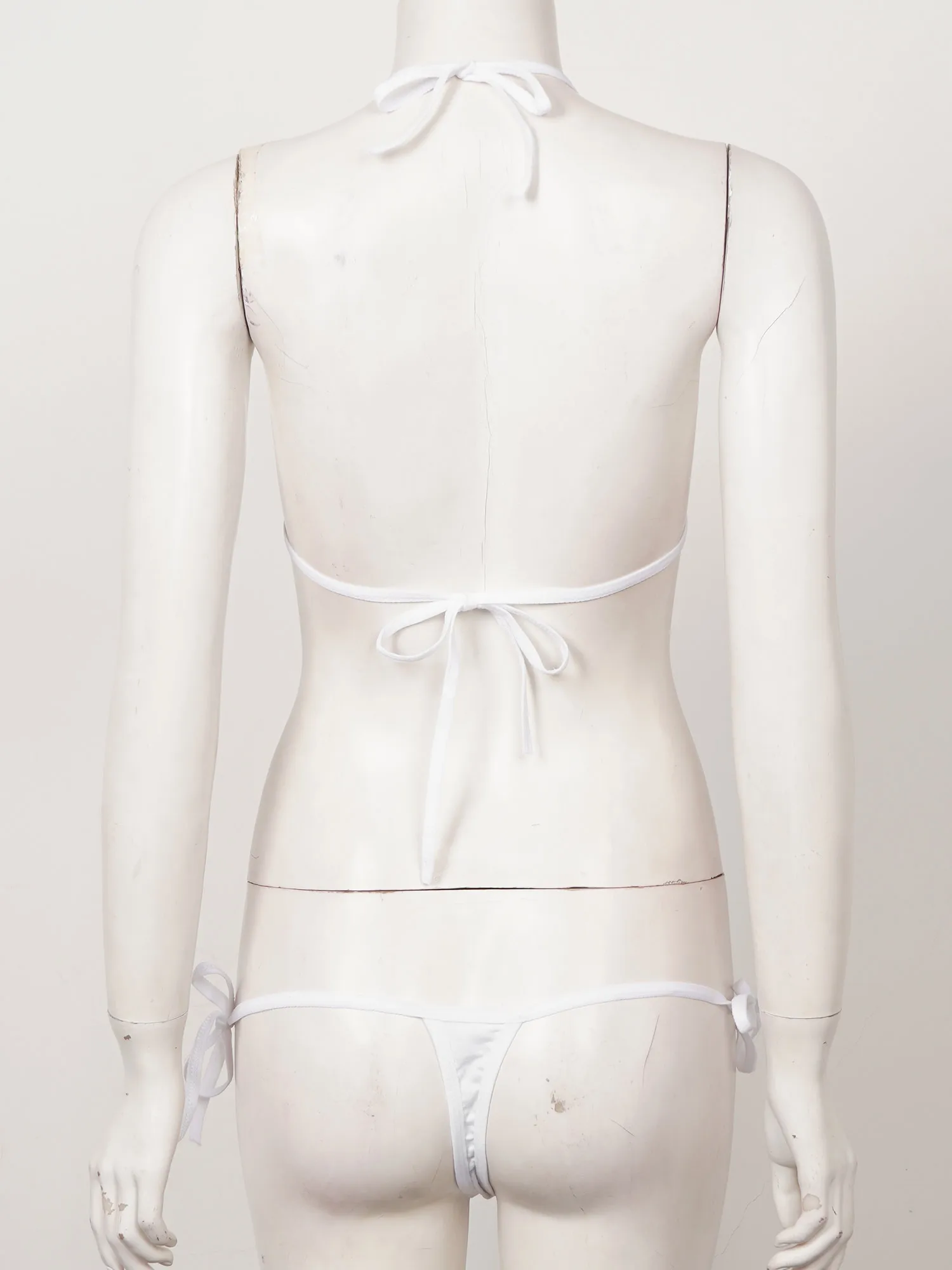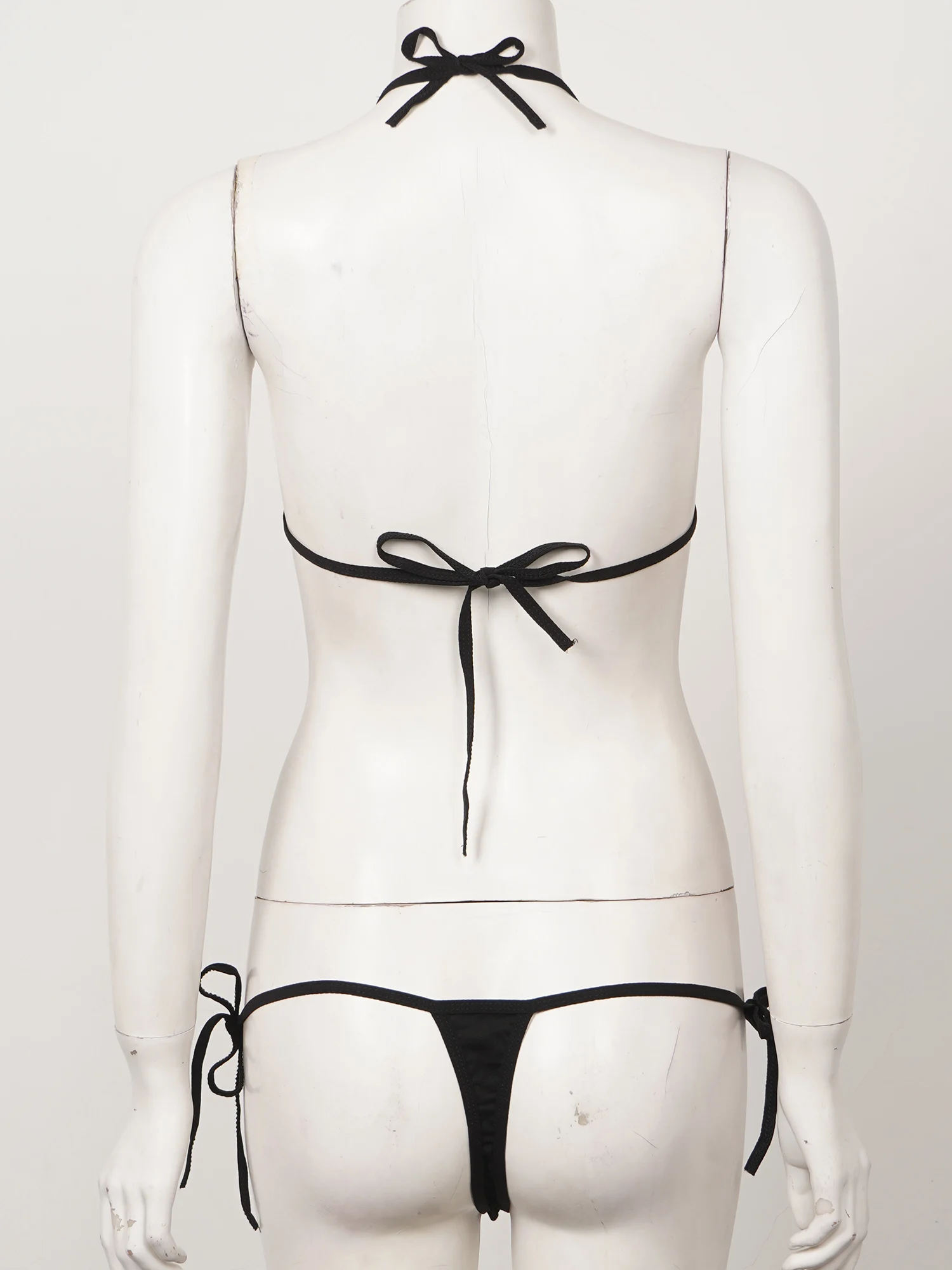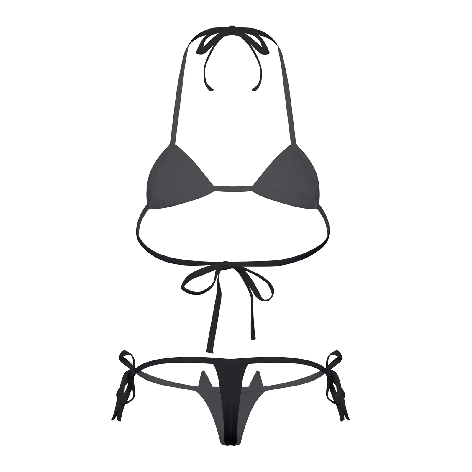 Регулируемые треугольные завязки на шее и спине, плавки-стринги на шнуровке.