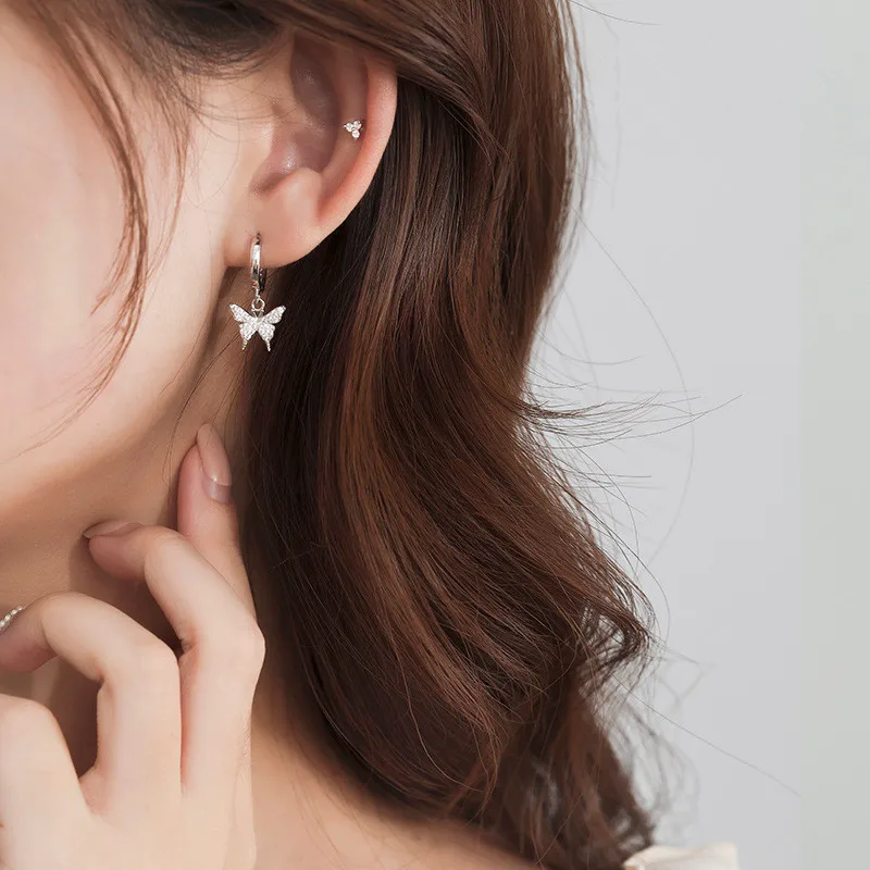 Серьги-гвоздики женские с кристаллами и бабочками, серебристого цвета
