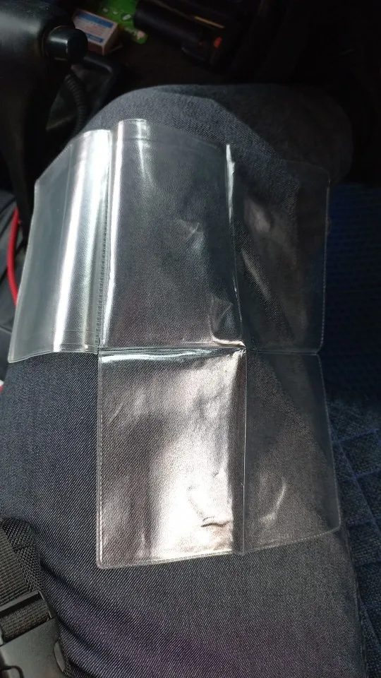 Пластик тонкий. Размер по высоте на 5мм меньше. Документы не помещаются или запихать можно, но вытаскивать невозможно.