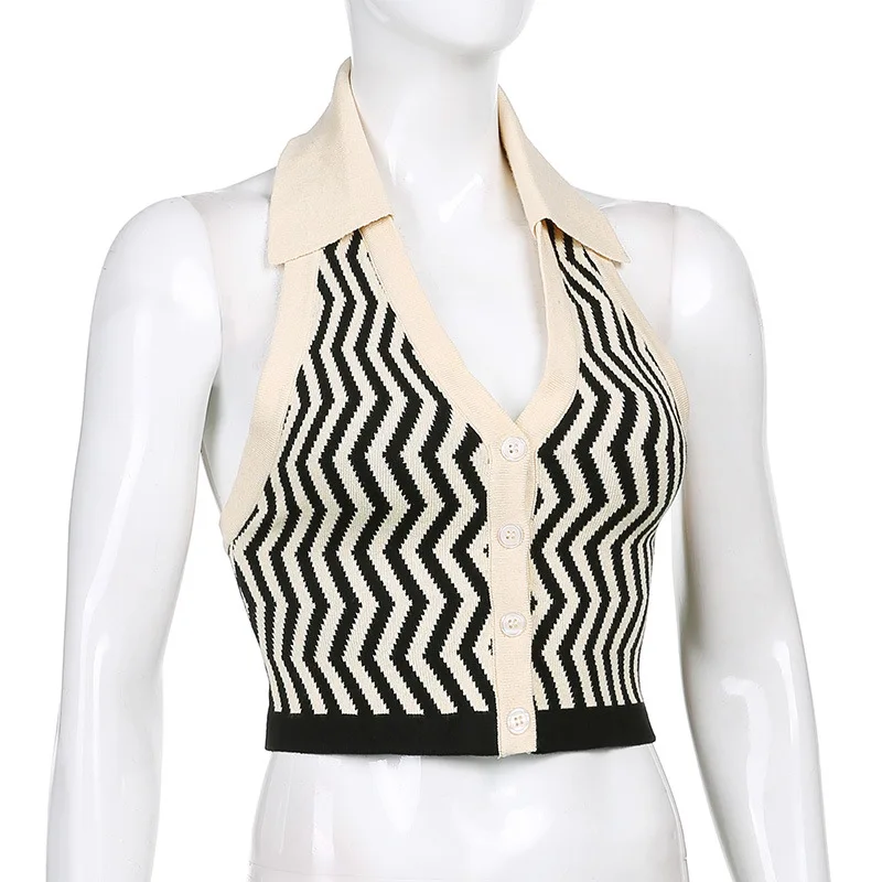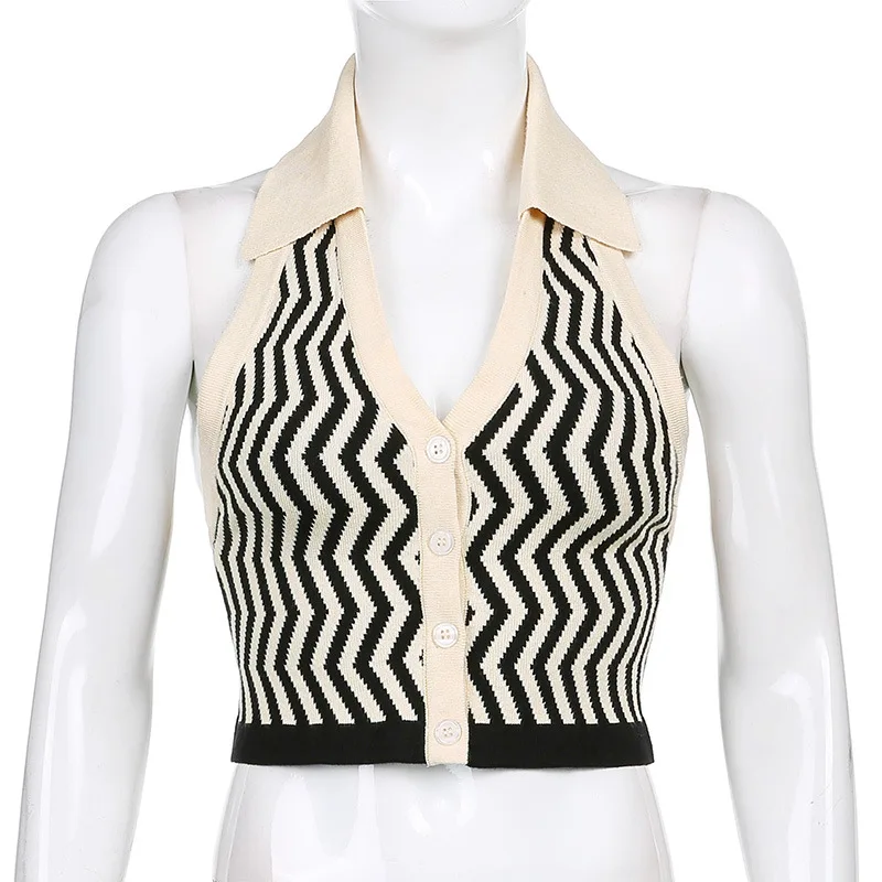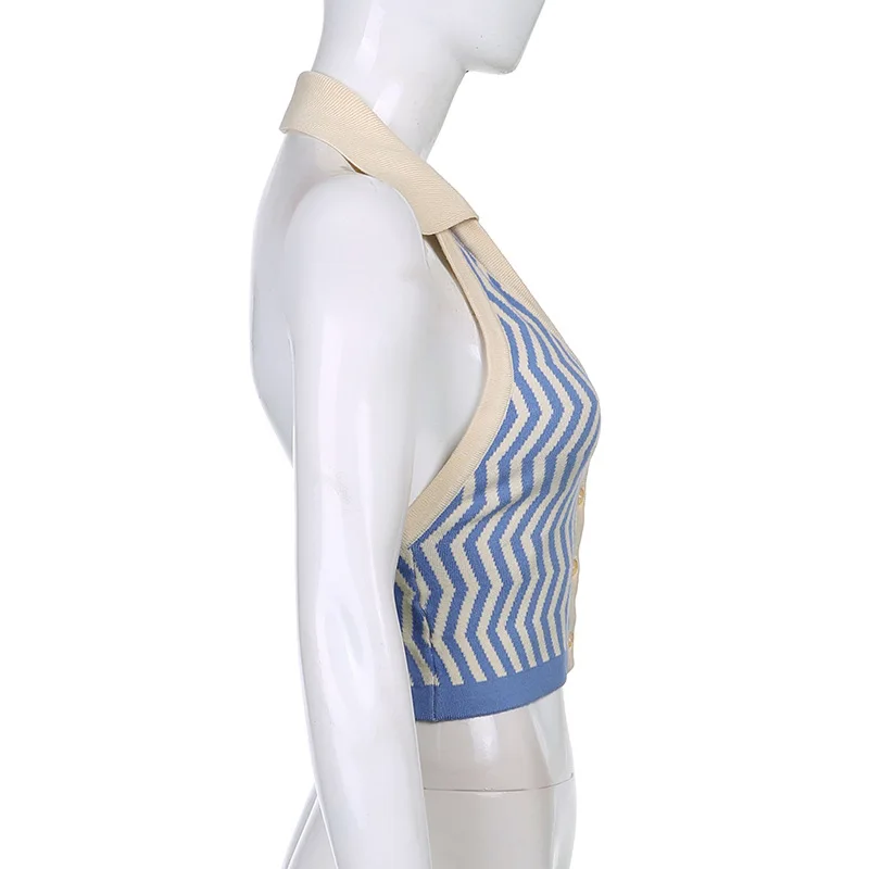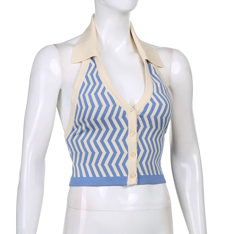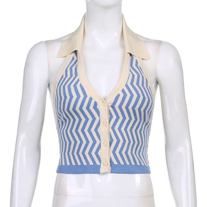 ALLNeon 90-х винтажные полосатые трикотажные укороченные топы с лямкой на шее E-girl эстетичные однобортные жилеты без рукавов модные синие Топы
