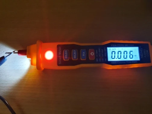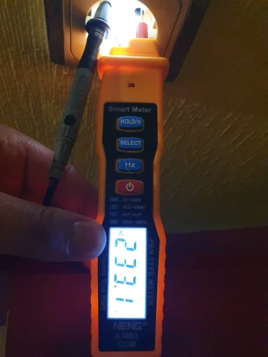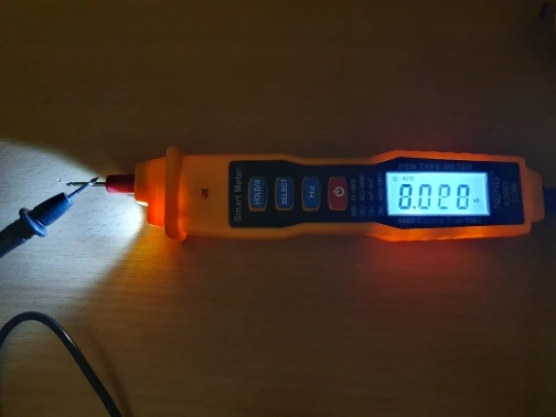 Приборчик интересный. Самостоятельно определяет что именно замеряем, по крайней мере сопротивление и вольтаж видит, дальше посмотрим. Подсветка срабатывает одновременно под "щупом" и на дисплее, отдельно не включить. Судя по щелчкам - в схеме использованы реле. На данный момент не понял, то ли батарейки в магазине попались плохие, то ли он жрёт энергию (2 батарейки Energiaizer за 15 минут).