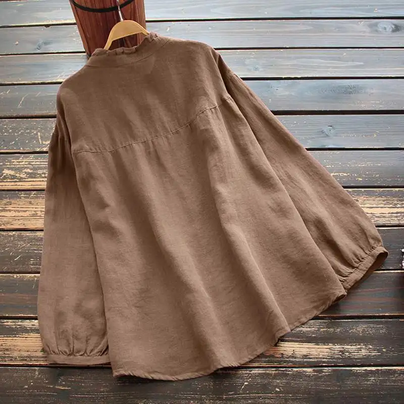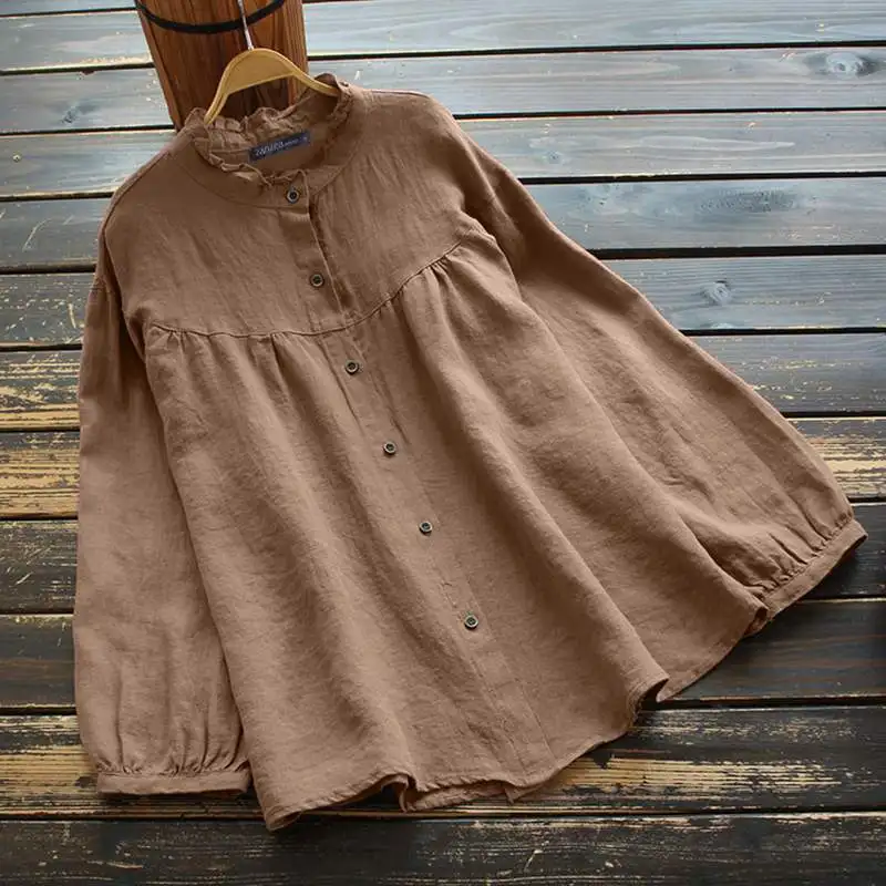 Женская винтажная блузка ZANZEA, весенние топы, Повседневная Однотонная рубашка с длинным рукавом, свободные блузки из хлопка и льна с пуговицами и оборками, туника, 2022