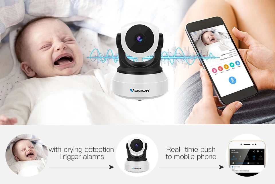 √ Камера может Интеллектуальное распознавание плачущего звука ребенка. Когда камера обнаруживает плачущее Звучание вашего ребенка, она сразу же тревожит вас сообщениями Eye4 APP, электронной почтой и FTP.