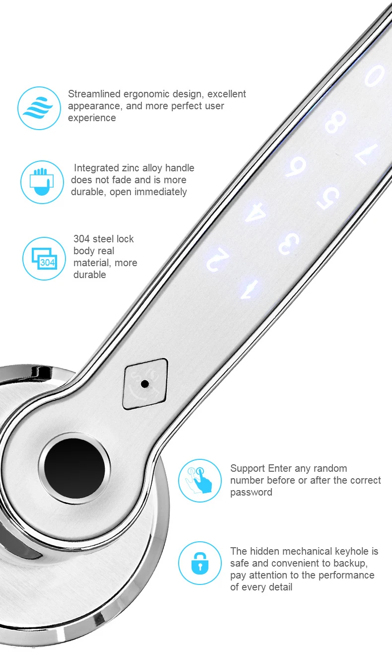 Способы разблокировки: отпечаток пальца, приложение TT LOCK, WIFI, Passcode, механический ключ, Al Alexa и google home