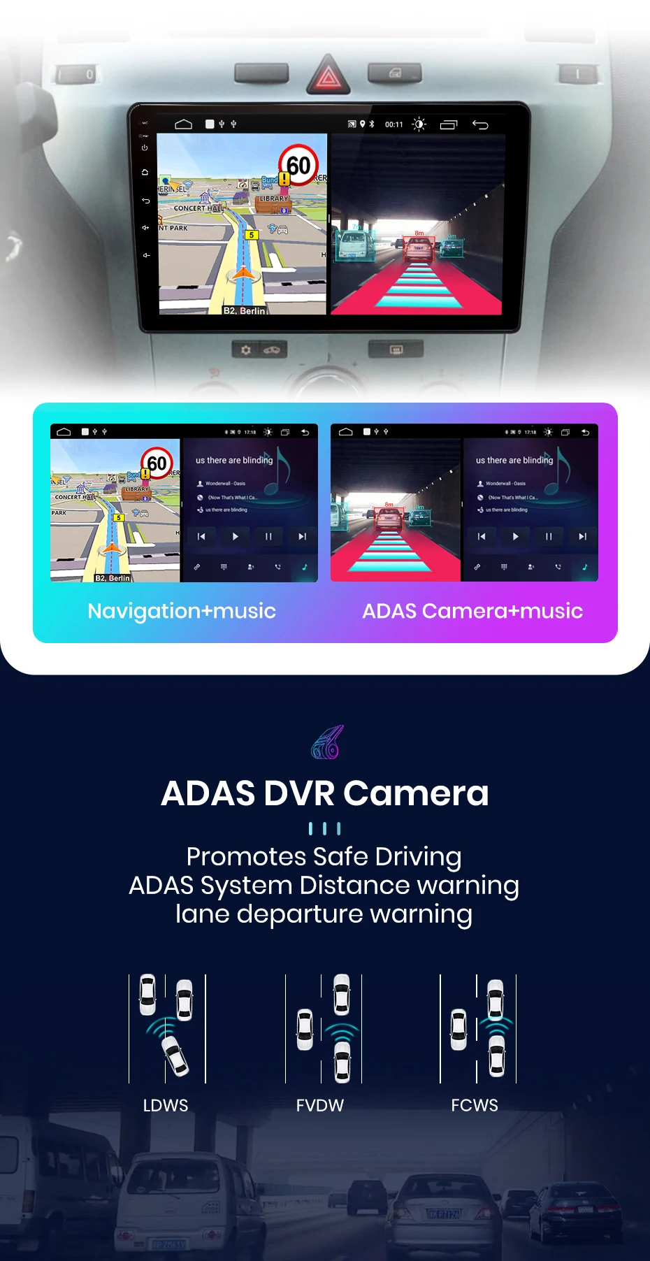 1. Голосовое управление AI: Просто скажите, что командное слово контролирует радио без рук, сделайте привод более безопасным2. ADAS DVR камера, контроль давления в шинах, OBD2, внешний микрофон, RCA кабель;