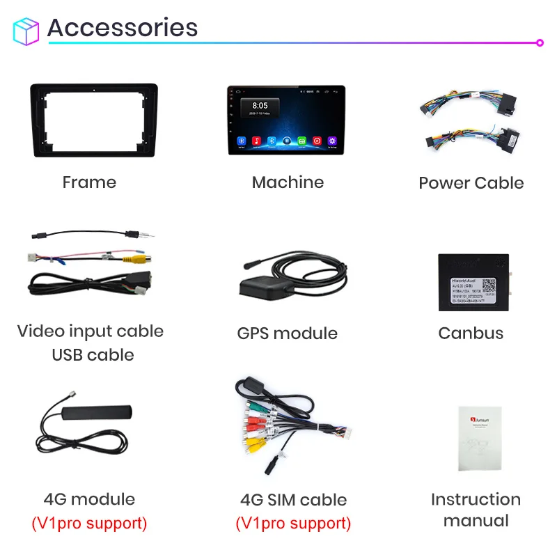 1. Штифт-штифт: Кабель питания Junsun radio' является штифтом для штифта, прост в установке;2. Встроенный Carplay/ Android Auto: Поддержка версии V1Pro, просто используйте кабель телефона, подключите его, стабильный и простой в использовании; (V1 поддерживает только Android Auto, но нужно покупать; V1C не поддерживает)3. Поддержка подголовника: только поддержка версии Junsun V1;