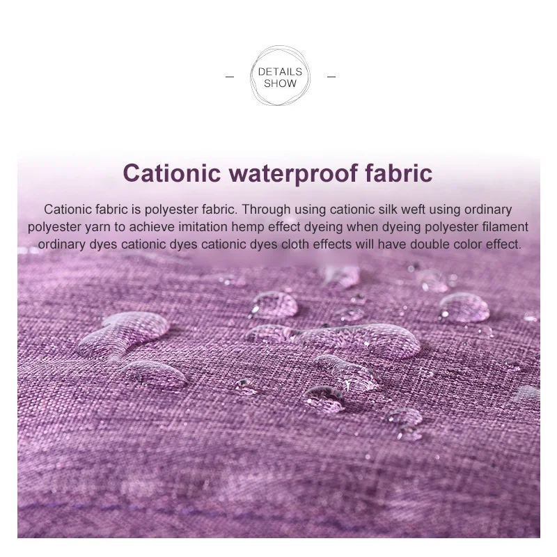 * Катионная водонепроницаемая ткань: катионная ткань-это полностью полиэфирная ткань, использующая катионную пряжу в направлении основы и обычную полиэфирную пряжу в направлении утка для достижения эффекта конопли. Красители также используются при окрашивании, обычные красители для полиэфирных нитей, и катионные красители для катионных нитей., Эффект ткани будет иметь двухцветный эффект.