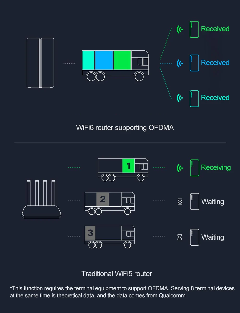 Когда нескольким устройствам необходимо передавать данные, традиционные роутеры должны выполнять несколько передач в свою очередь, в то время как технология OFDMA позволяет маршрутизаторам передавать данные до 8 устройств с одной передачей, уменьшение задержки в сети на 66%.