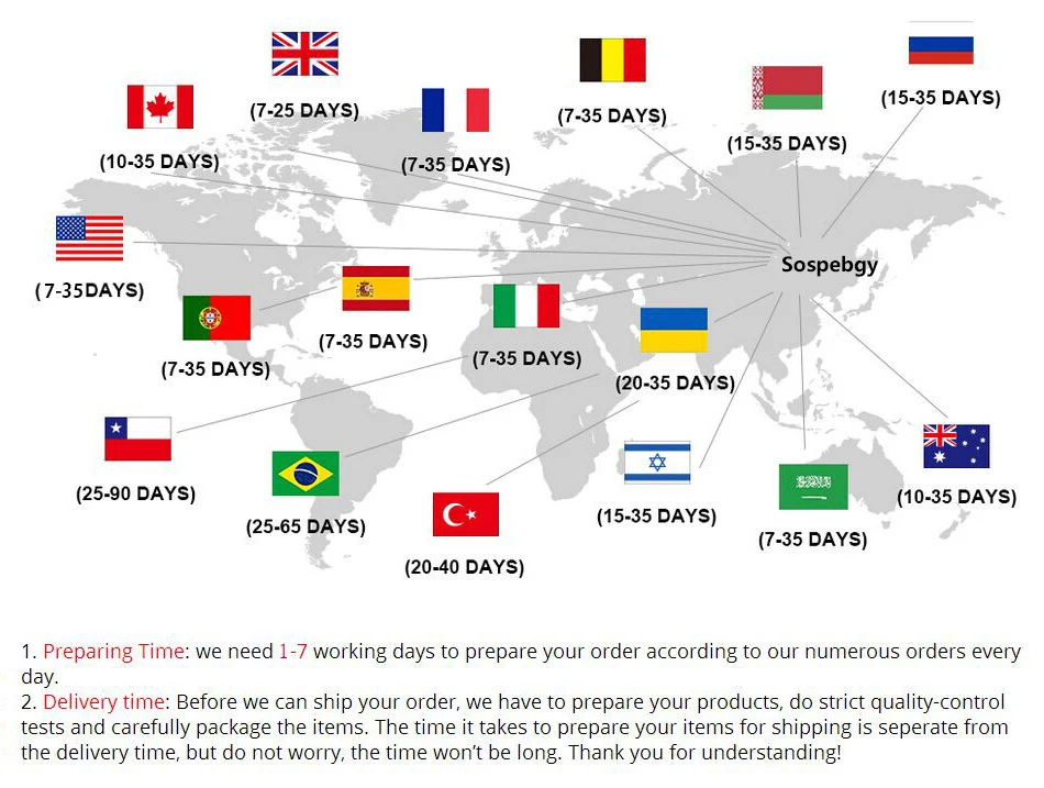 Мы отправим Ваш заказ в течение 1-2 дней после подтверждения оплаты. Мы не обрабатываем ваш заказ в воскресенье или праздничные дни. Пожалуйста, позвольте дополнительно 1-2 рабочих дня для заказов на выходные. Большинство отправленных упаковок доставляются в течение 3-5 рабочих дней со дня их отправки.