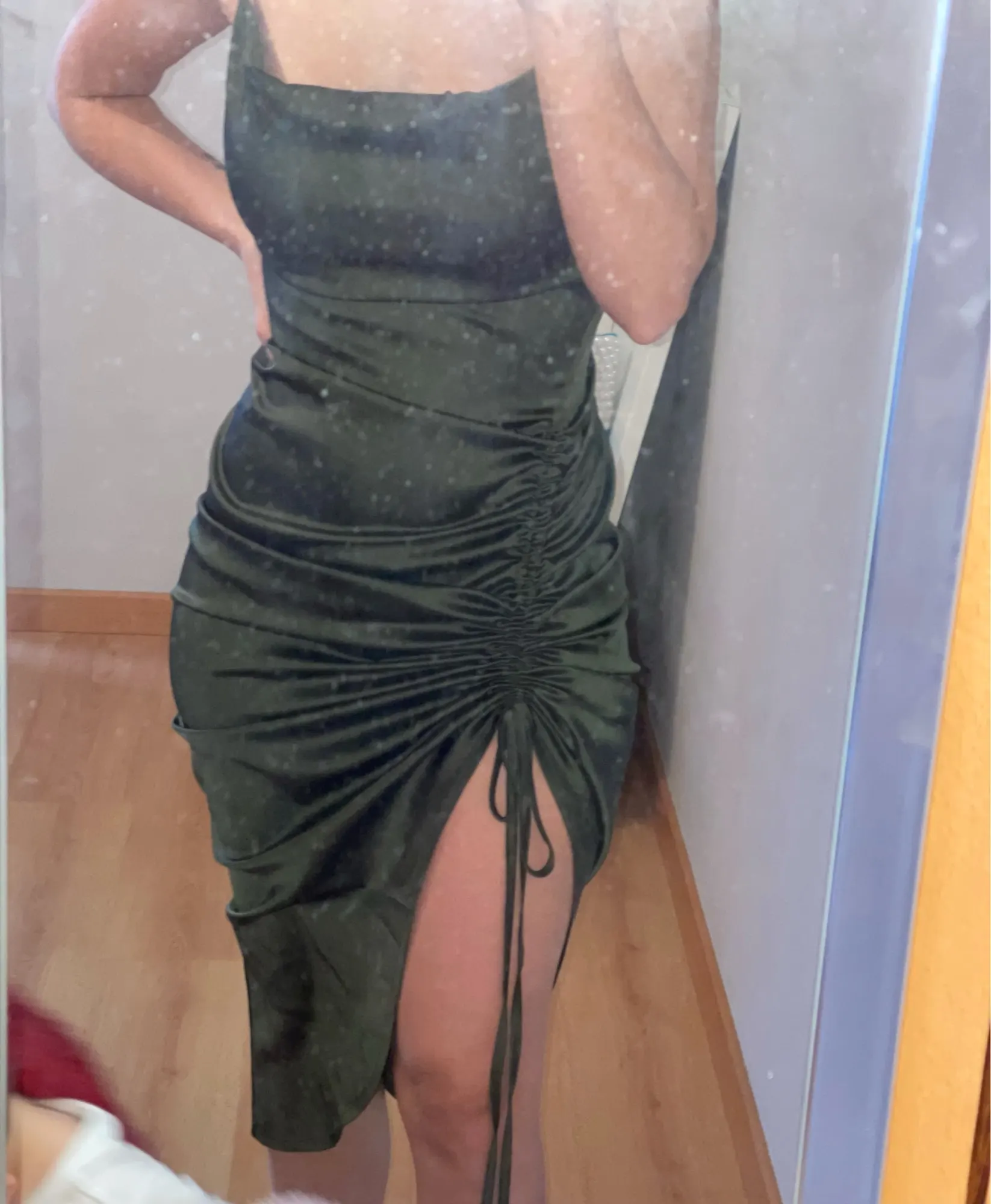 На параметры 93-70-100 взяла размер М, цвет beige. Вживую цвет не бежевый, а серебряный. Материал тоненький, немного просвечивает. В составе полиэстер. Лямки регулируются. Модель платья благодаря сборкам скроет недостатки фигуры. Высоту разреза можно регулировать. На мои параметры платье село хорошо. Задумка неплохая, жаль ткань подвела.