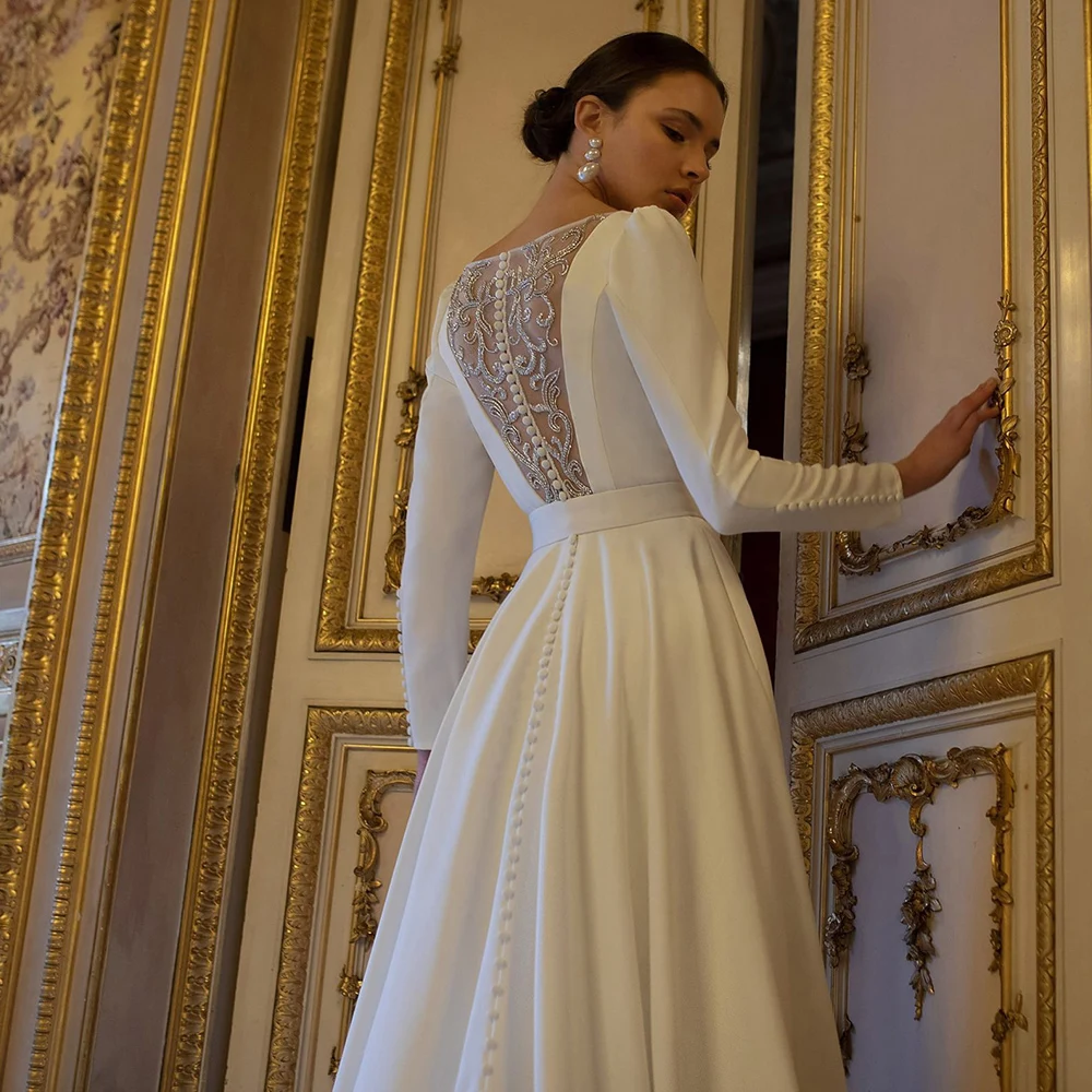 Элегантные атласные свадебные платья с длинными рукавами, 2021, трапециевидные, с бусинами и пуговицами, сексуальные, сзади, на арабском языке, свадебные платья для женщин, Vestido de Novia
