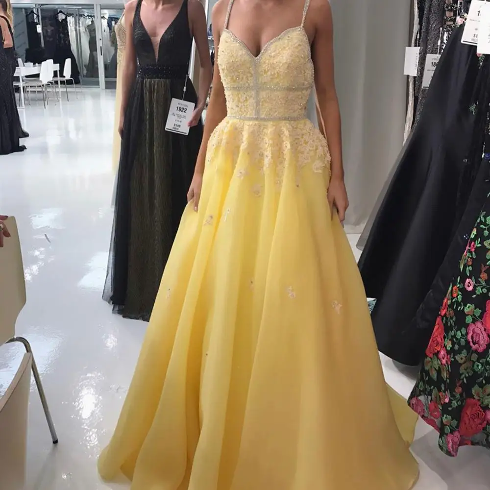 HONGFUYU желтый шифон вечерние платья Длинные спагетти ремешки кружевные платья в официальном стиле аппликации вечерние платья