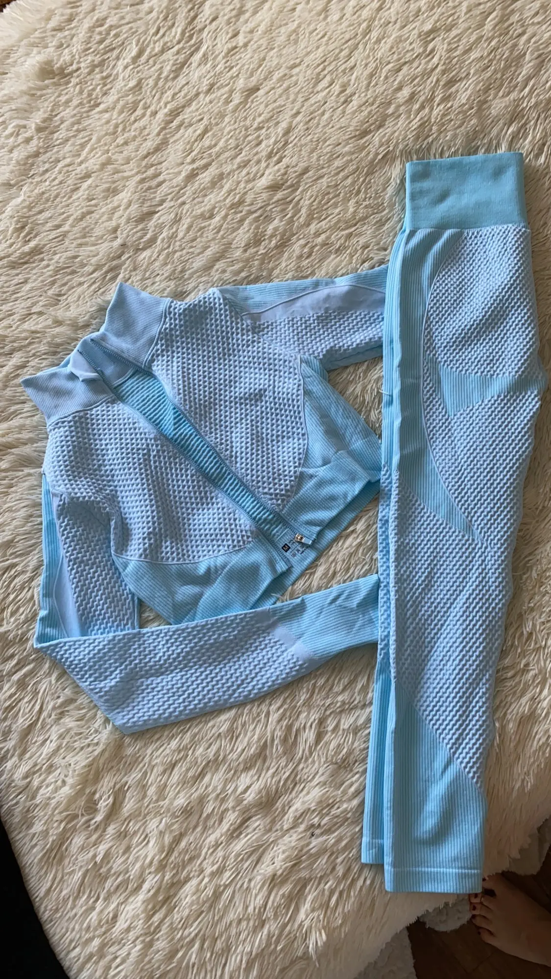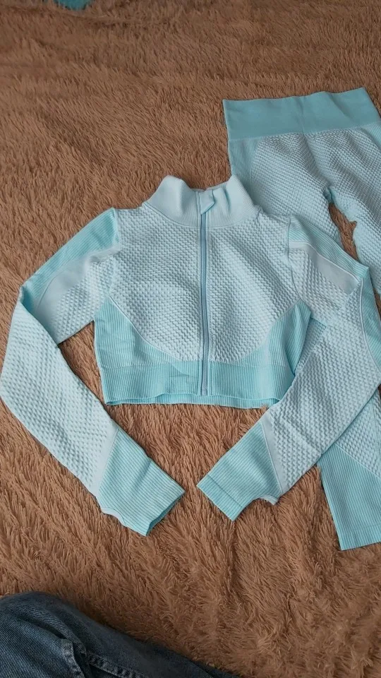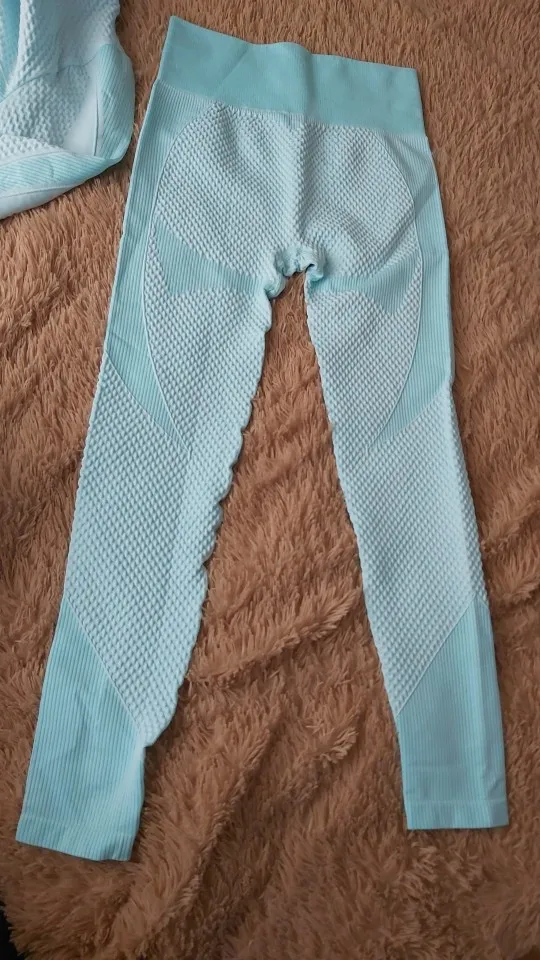 Костюм очень хорошего качества приятной расцветки. Ткань скорее всего хлопок с эластаном. Приятная к телу, не колется. Нигде не просвечивает, довольно плотная. Размер S совпадает с российским, у кого пышная грудь, топ скорее всего будет маловат. На рост 173 лосины с высокой талией, не короткие. Ткань хорошо тянется. Рекомендую. Доставка 3 недели