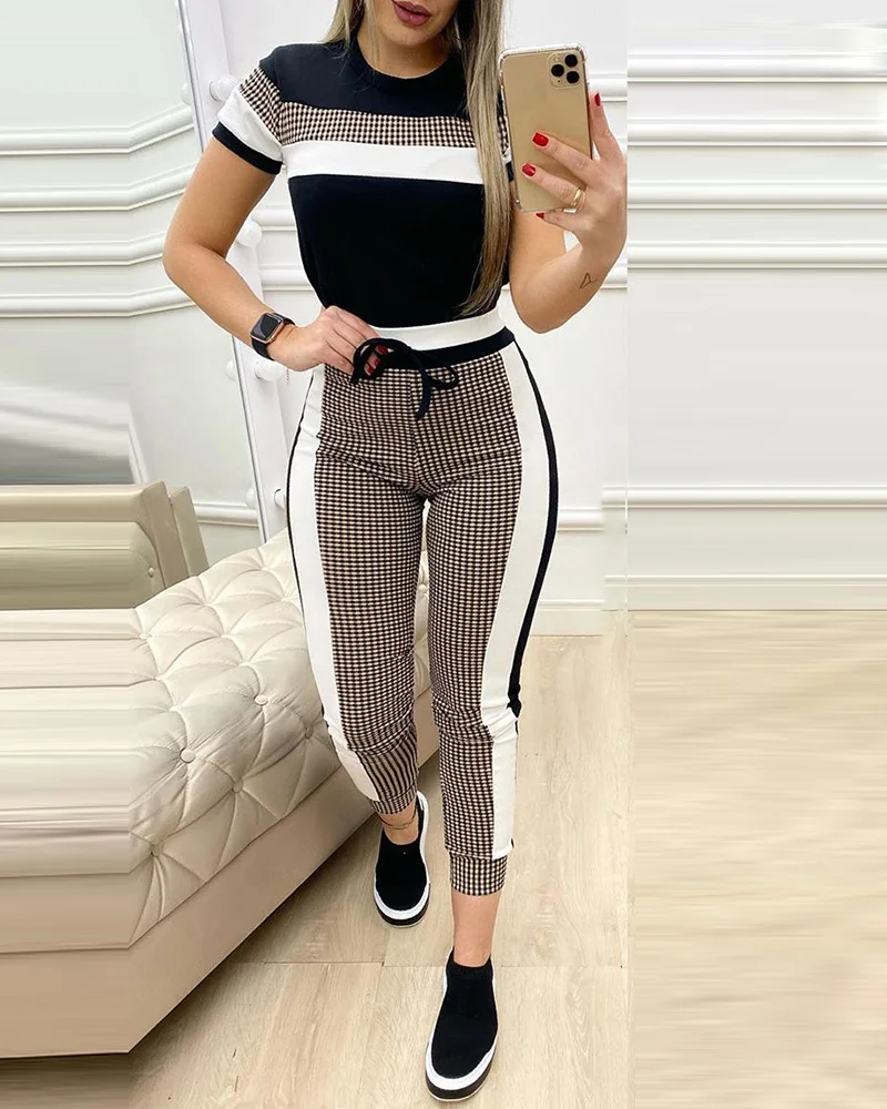 Костюм спортивный женский в клетку с принтом, Осенний повседневный комплект со штанами-карандаш с коротким рукавом и круглым вырезом