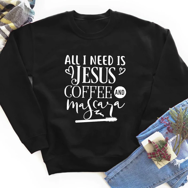 Все, что мне нужно, это кофейный свитшот с Иисусом и тушью для ресниц, Смешные Пуловеры для макияжа, женские Религиозные христианские свитшоты