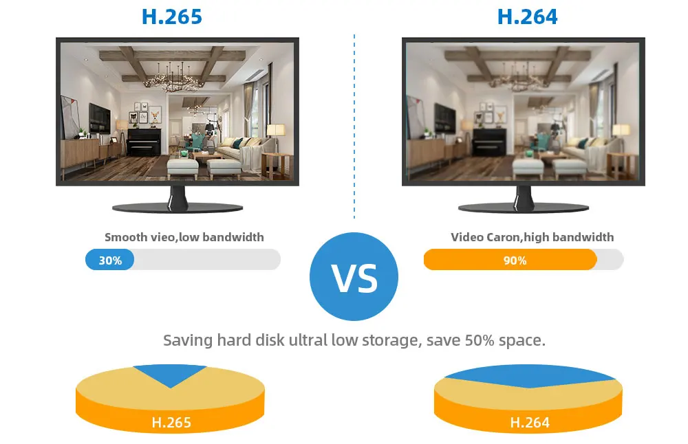 H.265 более четкое, HD разрешение предлагает вам лучшее качество изображения в более низкой скорости. Экономит больше места для хранения,Может уменьшить размер файлов 40%-50%, сэкономить место для хранения HDD и снизить стоимость покупки.