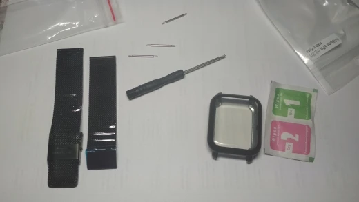 Отличный комплект! Быстрая доставка(меньше 14 дней)! Отлично запакован. Всё целое!!! В комплекте идёт :браслет, бампер с полной защитой дисплея(что очень важно)+2салфетки и отвёртка(что немаловажно для девушек с длинными ноготками).И ещё удобно то, что браслет регулируется по желанию!!! Единственный минус - это бампер великоват(не плотно держится)!!! Всё супер!!! Не знаю, насколько долго будет сохраняться цвет, надеюсь, что надолго, но пока - что товаром довольна! Всем советую!!!