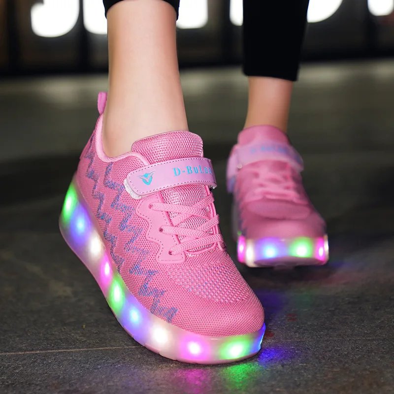 Детские светящиеся роликовые коньки, кроссовки с двойными колесами для девочек и мальчиков, зарядка через USB, размеры 28-43