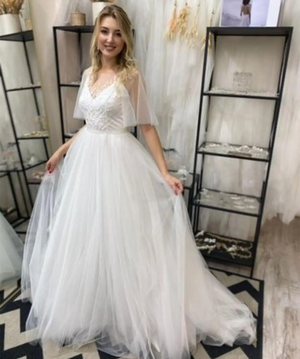 Женское свадебное платье, белое Тюлевое платье-трапеция с V-образным вырезом, до пола, 2021