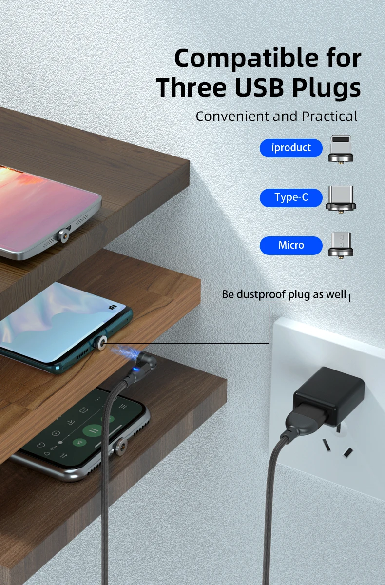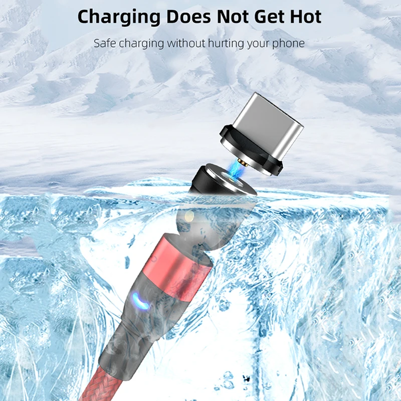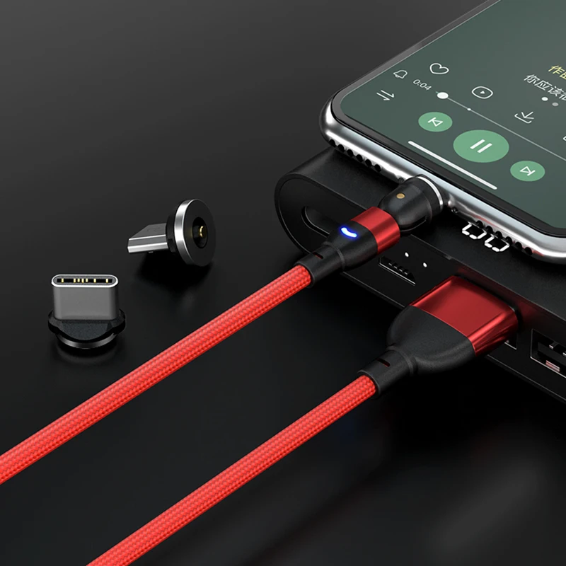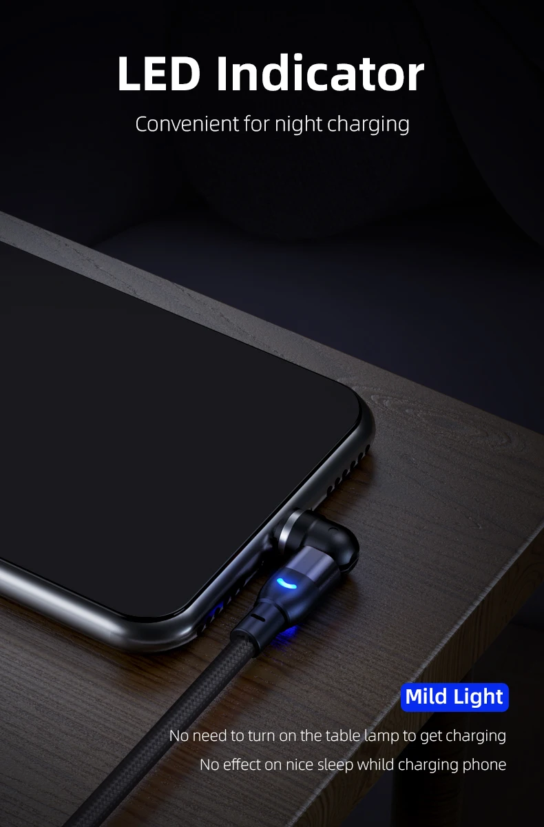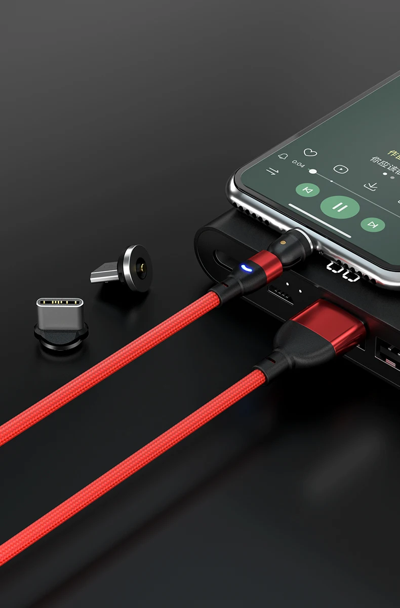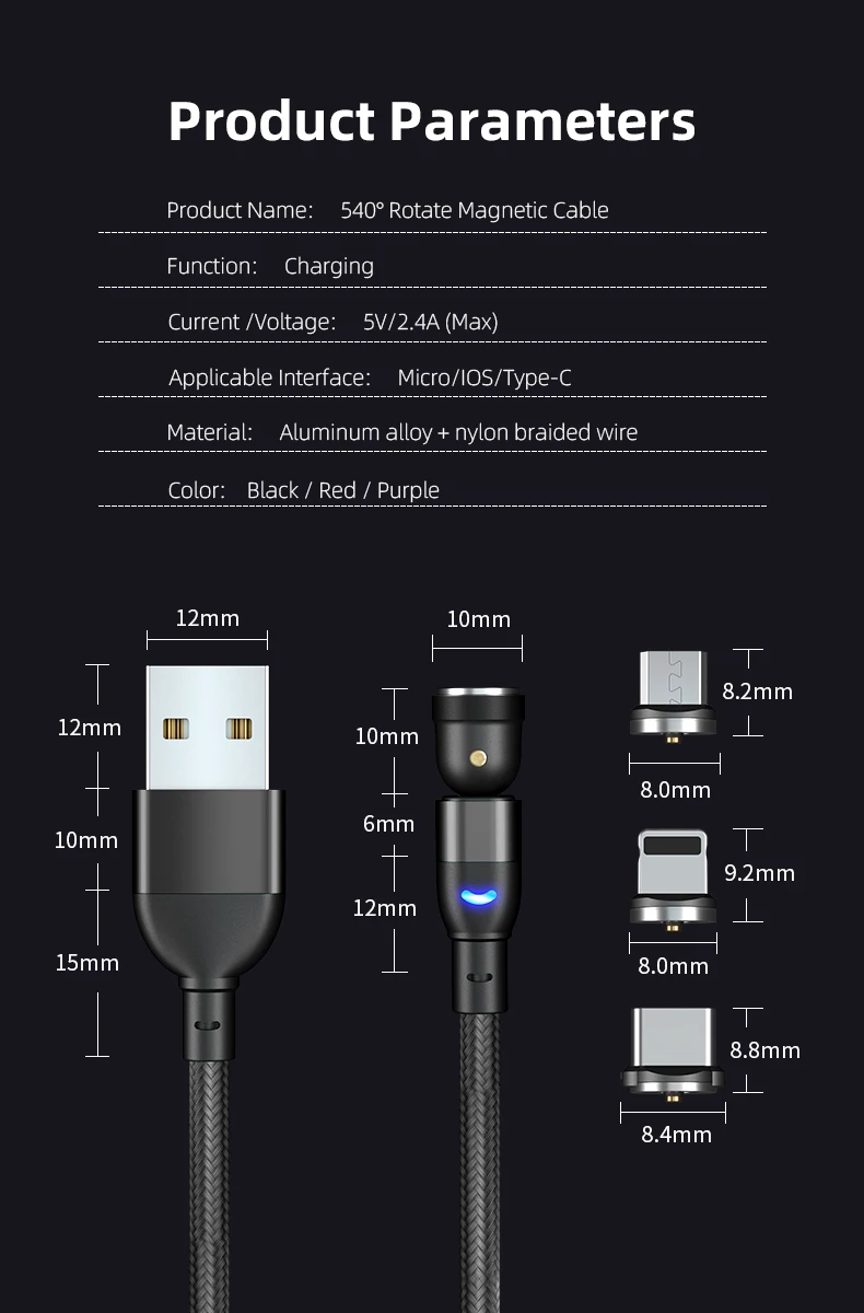 Спецификация продукта Цвет: черный/красный/фиолетовый Длина: 1 м/2 м Разъем: USB-C / Micro / iPhone Характеристики: поддерживается вращение на 90 °/180 °/360 °/540 °, сильный мегнет, мягкий световой светильник Материал: нейлон + металл Ток: 2.4A Быстрая зарядка