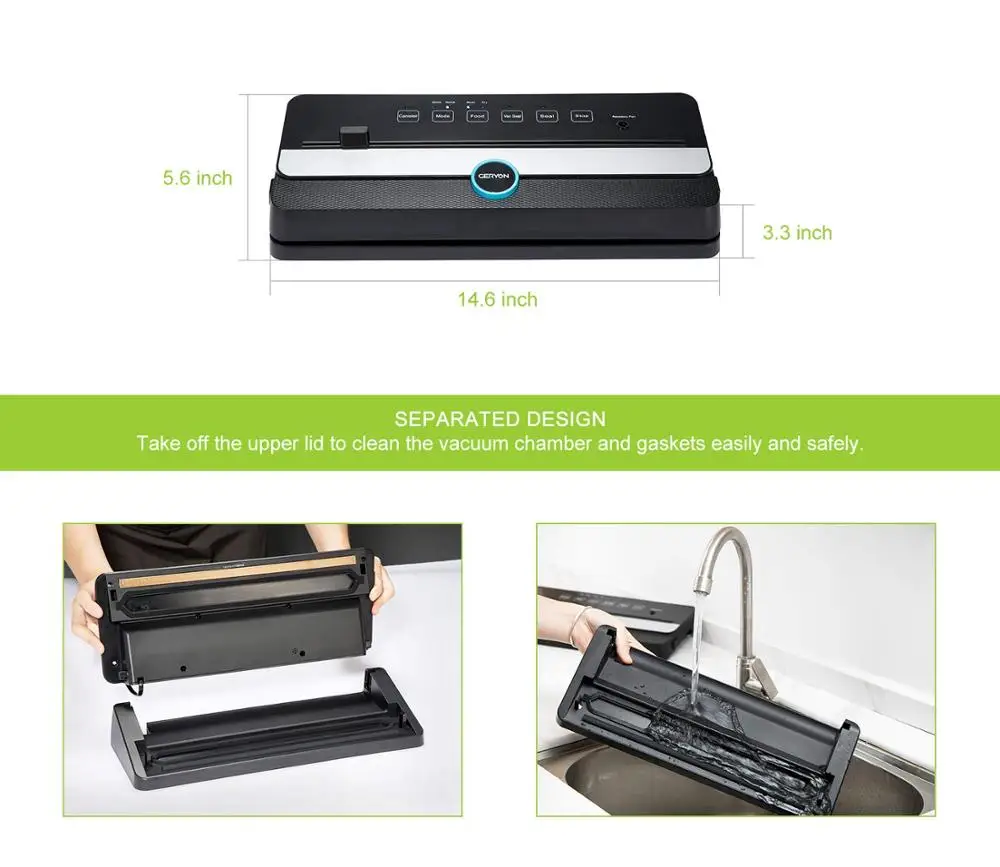 Название продукта: Лучший вакуумный упаковщик Функция: вакуумный упаковщик пищевых продуктов Напряжение: 220 В Мощность: 110 Вт Степень вакуума: 22 дюйма рт. Ст. Ширина нагревательного провода: 3 мм Длина уплотнения: 30 см Режим работы: полностью автоматический/ручное управление Цвет: черный Размер: 36,6*14,2*6,7 см