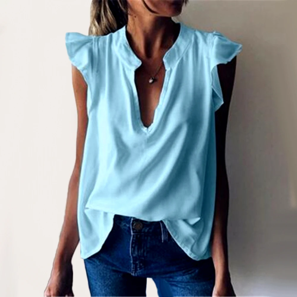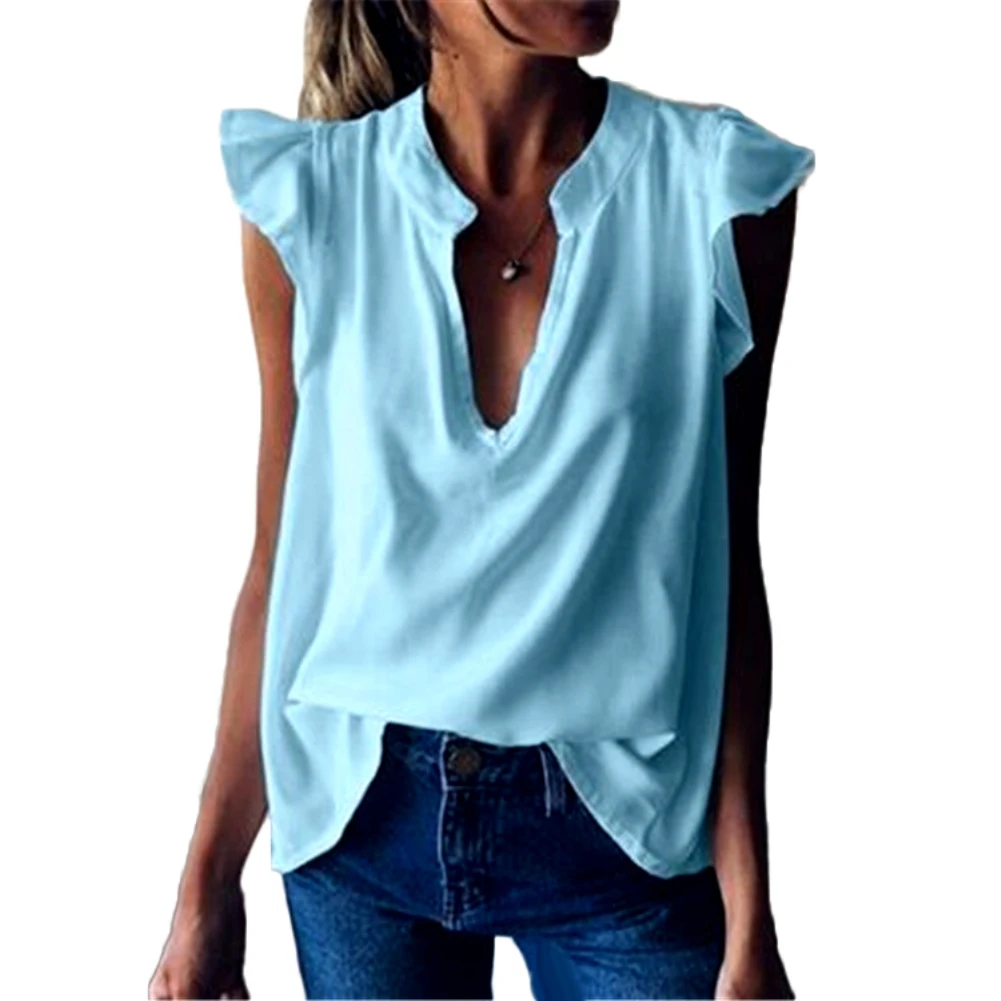 Новая женская блузка, модная однотонная Свободная рубашка с V-образным вырезом и коротким рукавом с оборками, женская блузка и топ, 2020