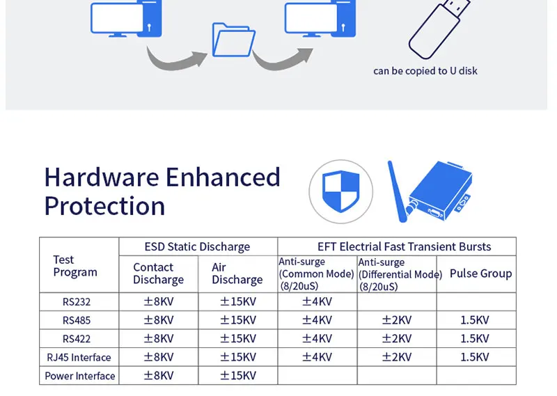 Введение HF2211-это Последовательный RS232/RS485/RS422 к WiFi/Ethernet-серверу, используемый для прозрачной передачи данных. HF2211-это недорогой сервер последовательных устройств, функция которого заключается в реализации двунаправленной прозрачной передачи между RS232/RS485/RS422 и WiFi/Ethernet. Обзор характеристики MCU с 4 Мб флэш-памяти и 8 Мб SRAM. Запуск на eCos Поддержка TCP/IP/Telnet /Modbus TCPProtocol Поддержка RS232/RS422/RS485 для преобразования Ethernet/Wi-Fi, последовательная скорость до 460800 bps Поддержка режима STA/AP + STA Поддержка маршрутизатора или мостового сетевого режима работы. Поддержка 10/100M Ethernet автоматического согласования Поддержка легкого конфигурирования веб-интерфейса или ПК IOTManager Поддержка протоколов безопасности, таких как assl/AES/DES3 Поддержка веб-обновления OTA Wirelss Широкий вход постоянного тока 5 ~ 36VDC или 9 ~ 50VDC Размер: 95x65x25 мм (Lx W x H) Сертификаты FCC/CE/RoHS Информация о системе Основная Частота процессора MIPS 320 МГц Вспышка и SDRAM :4 Мб * 8 Мб Операционная система: eCos Ethernet Интерфейс Стандартный 1 RJ45 скорость 10/100 м Защита: изоляция 8 кВ Номер порта 1RS232/RS485/RS422 Стандарт интерфейса RS232: DB9 RS485/RS422: 5,08 мм разъем Скорость передачи данных TTL: 600 bps ~ 460800bps Рабочая температура. -Температура хранения 25 ~ 85 °C. -45 ~ 105 °C,5 ~ 95% RH (без конденсации) Входное напряжение 5 ~ 36VDC или 9 ~ 50VDC Рабочий ток ~ 200 мА мощность <700 мВт Аксессуар 1 * Адаптер питания 1 * серийный кабель 1 * кабель Ethernet 1 * WiFi антенна