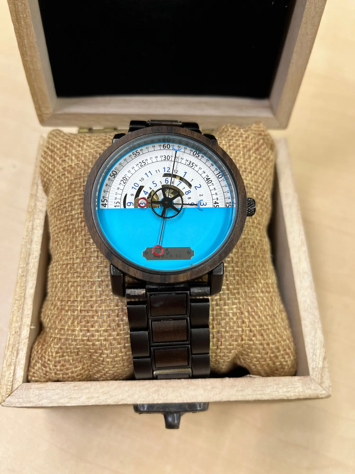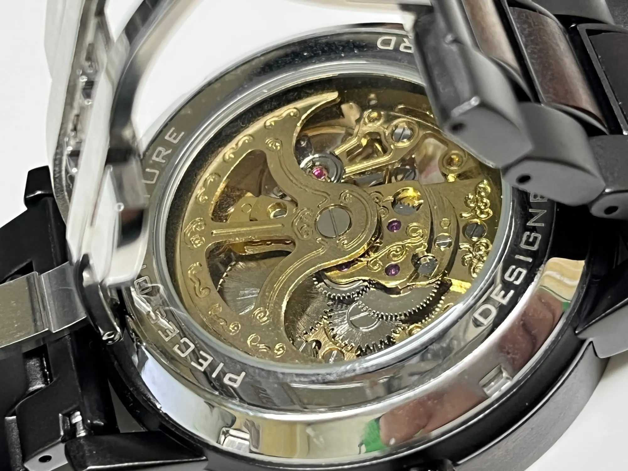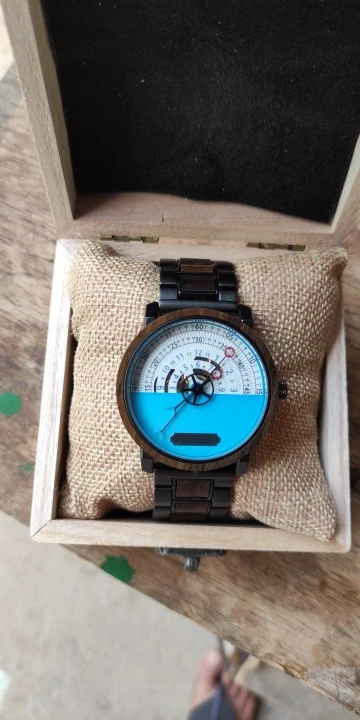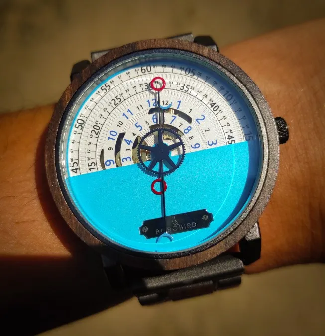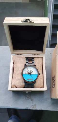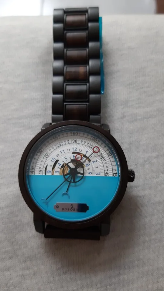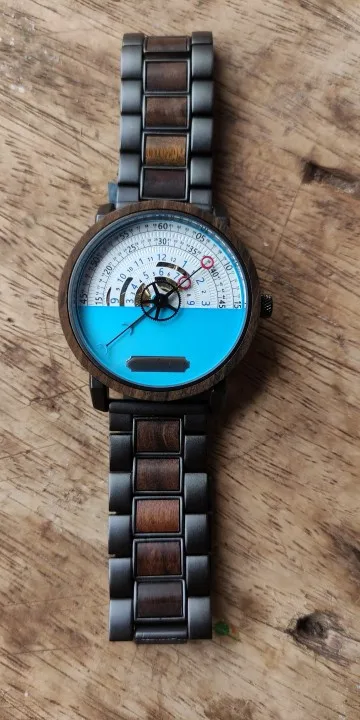 Корпус, внутренняя линия браслета, вероятно, деревянная. Хорошо держит время до сих пор. Я бы сказал, что продукт намного превышает мои ожидания. Прозрачная задняя крышка позволяет видеть движение, которое является довольно украшенным. Хорошая покупка. Настоятельно рекомендуется. Давайте не будем жаловаться на неровную краску на деревянных деталях.