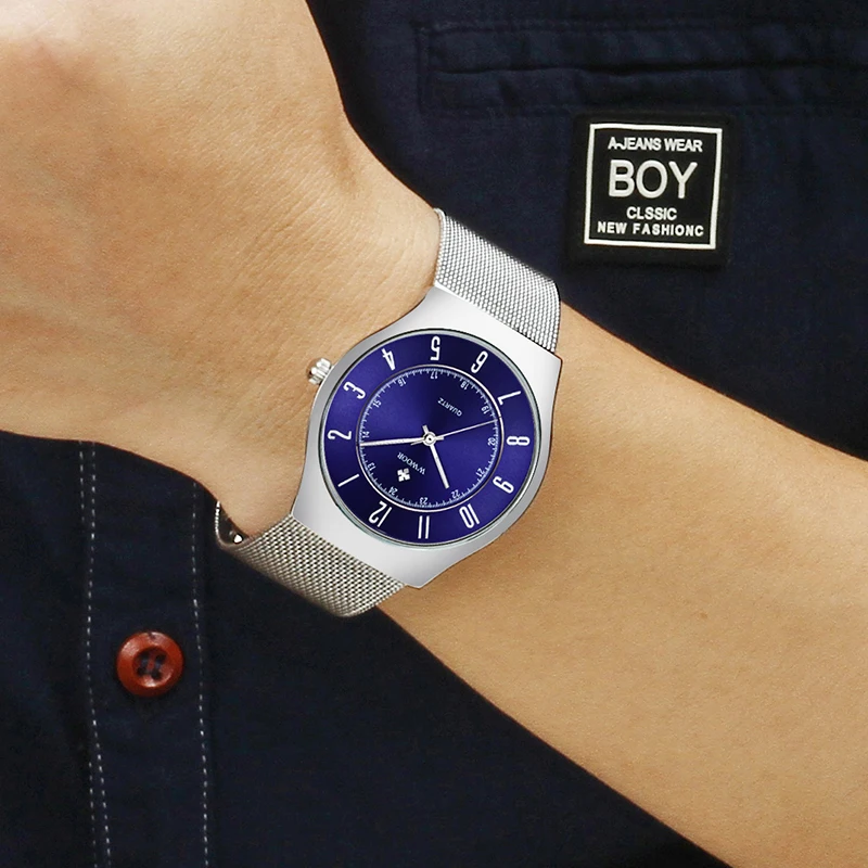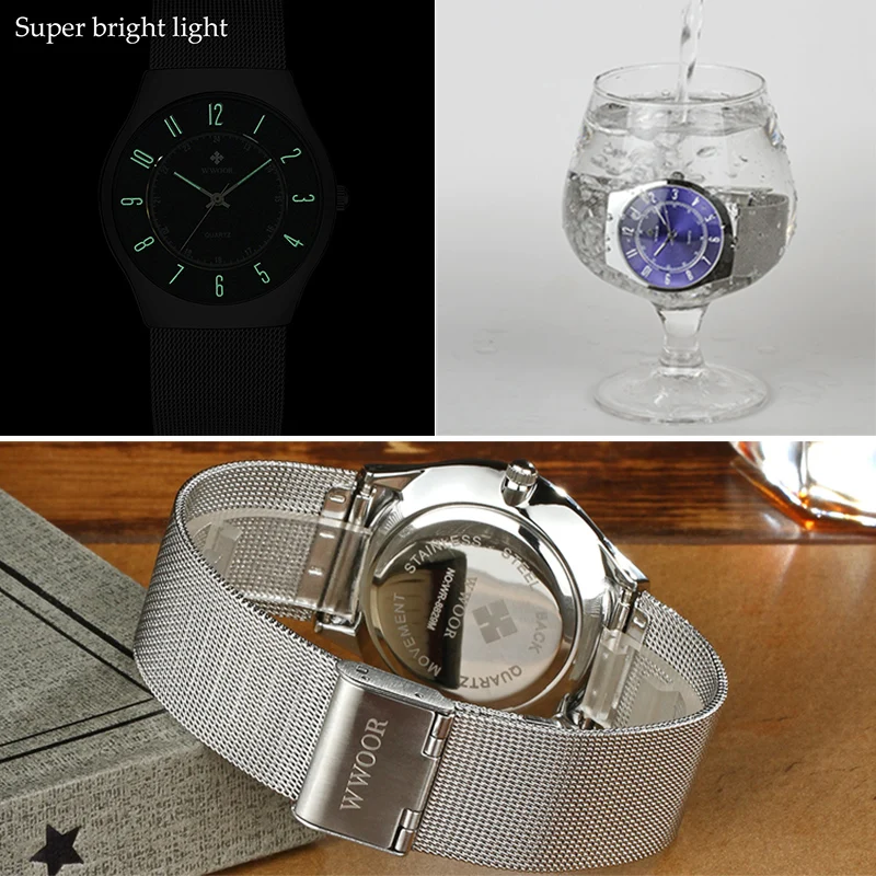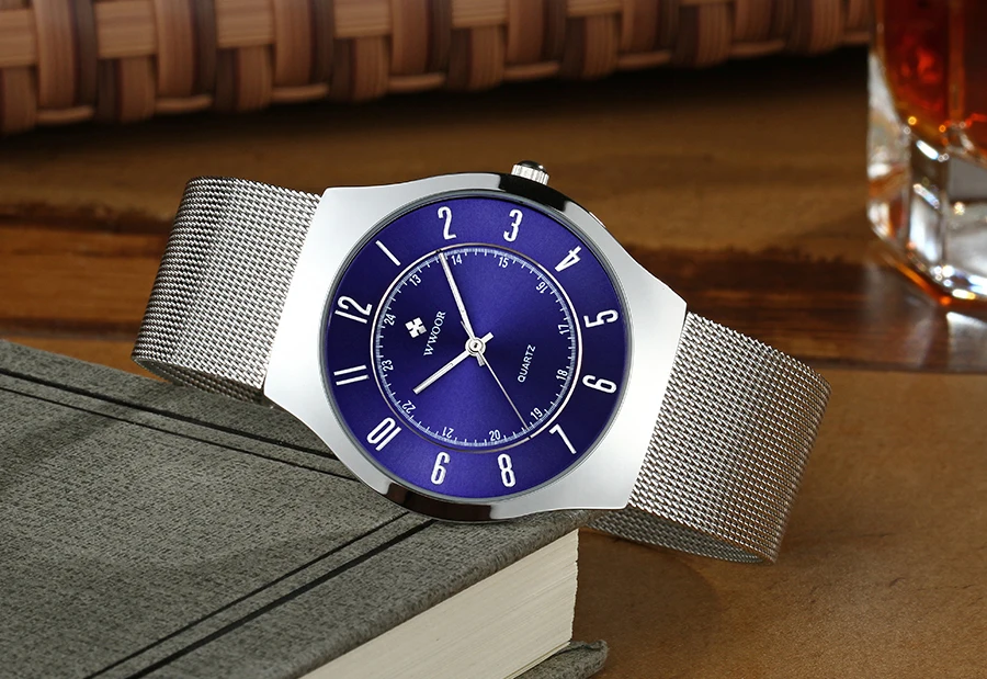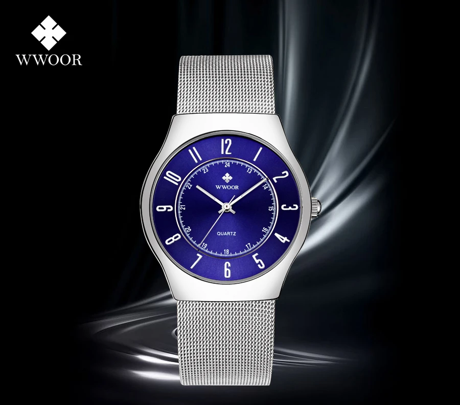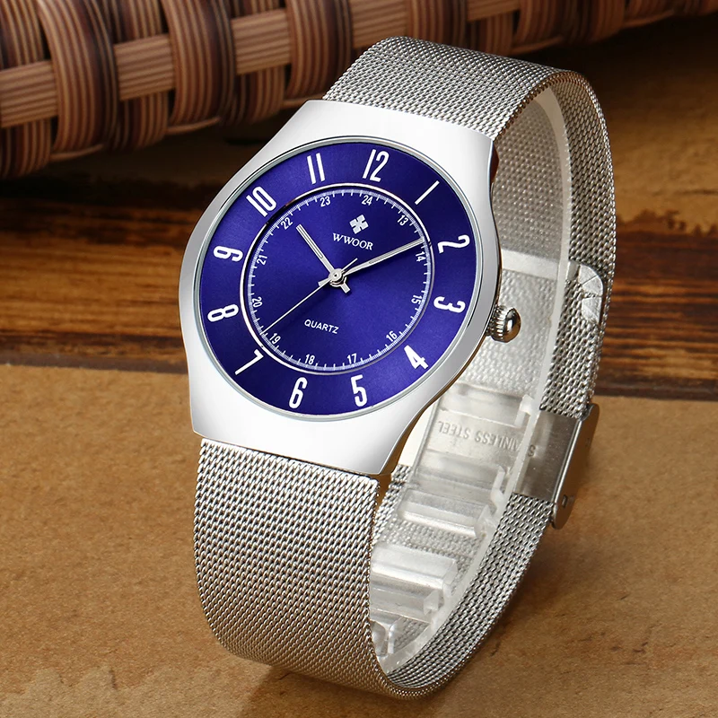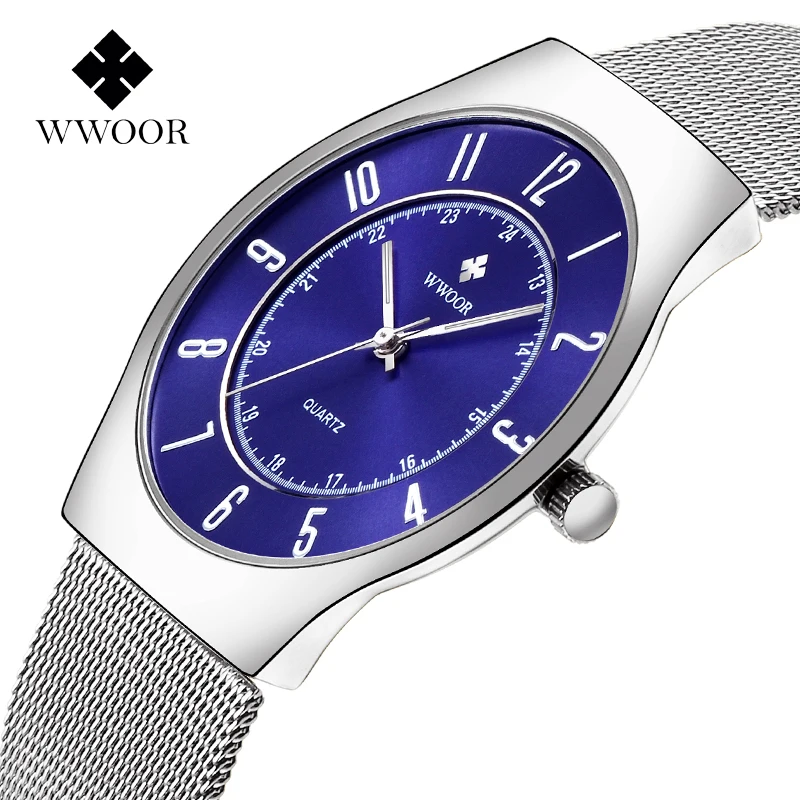 Мужские наручные часы WWOOR, синие, спортивные, кварцевые, водонепроницаемые, с ультратонкой стальной сеткой