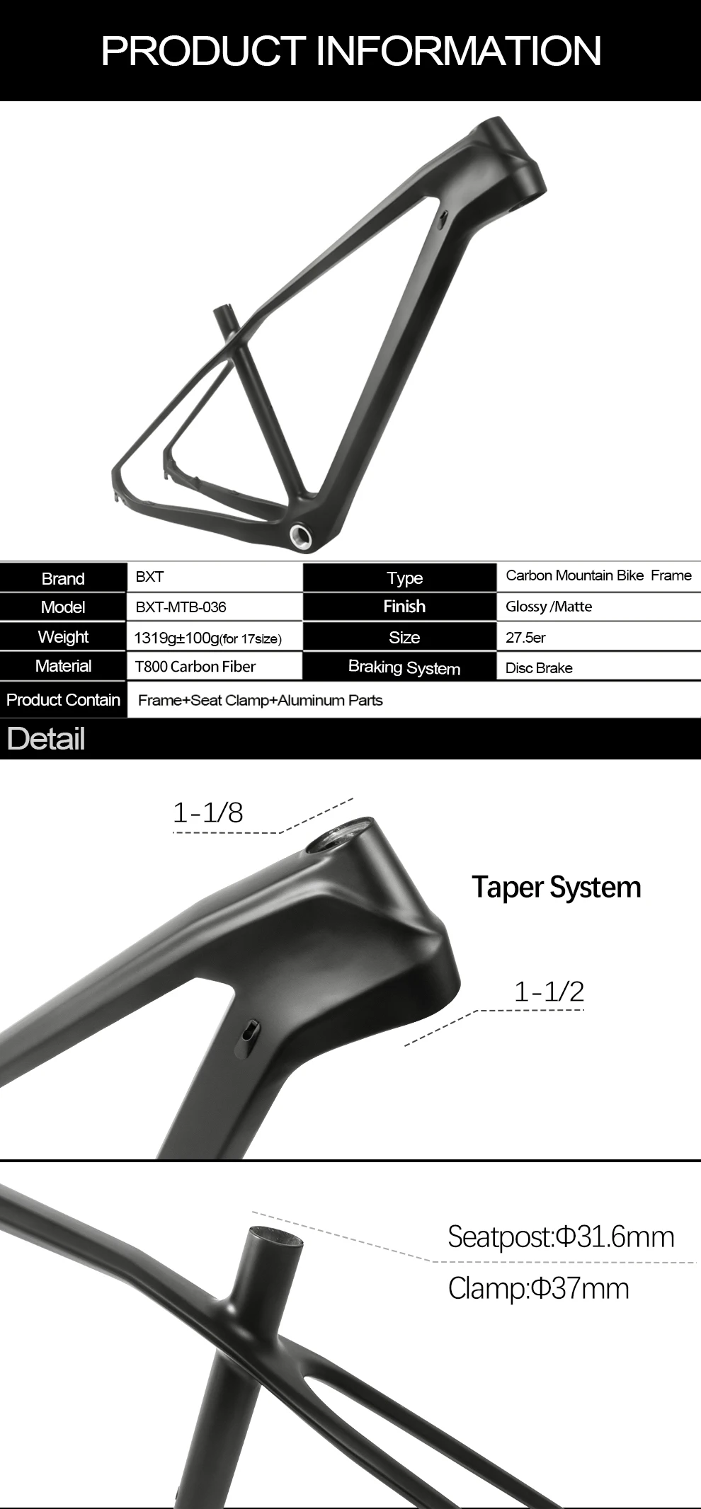 Название бренда: BXTМодель: BXT-MTB-036Название продукта: рама для горного велосипеда из углеродного волокна 27,5 ERОтделка: глянцевая/матоваяВ наличии Размеры: 15,5 Дюймов, 17 дюймов, 18,5 дюймов, 20 дюймовBB:BSAИзделие содержит: каркас + зажим сиденья + алюминиевые деталиТормозная система: дисковый тормозЕсли вам нужны пользовательские цвета или нет логотипа, пожалуйста, свяжитесь с нами.Если вы хотите купить заднюю ось 142*12 мм или гарнитуру, пожалуйста, обратитесь в службу поддержки клиентов