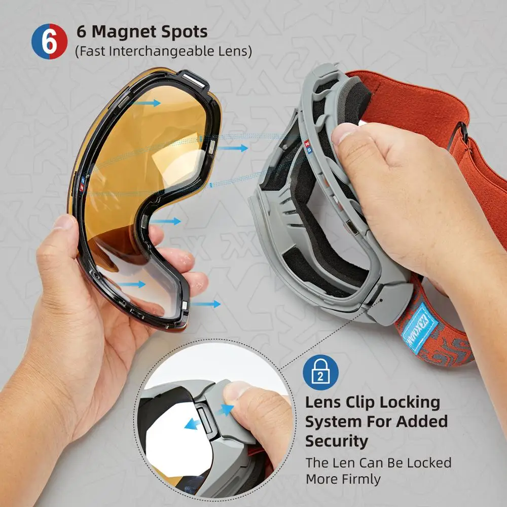 1. Снежные очки XCMAN с 6 магнитами N45 и 2 зажимами для захвата. Это позволяет быстро менять линзы, а также максимально безопасно и долговечно.