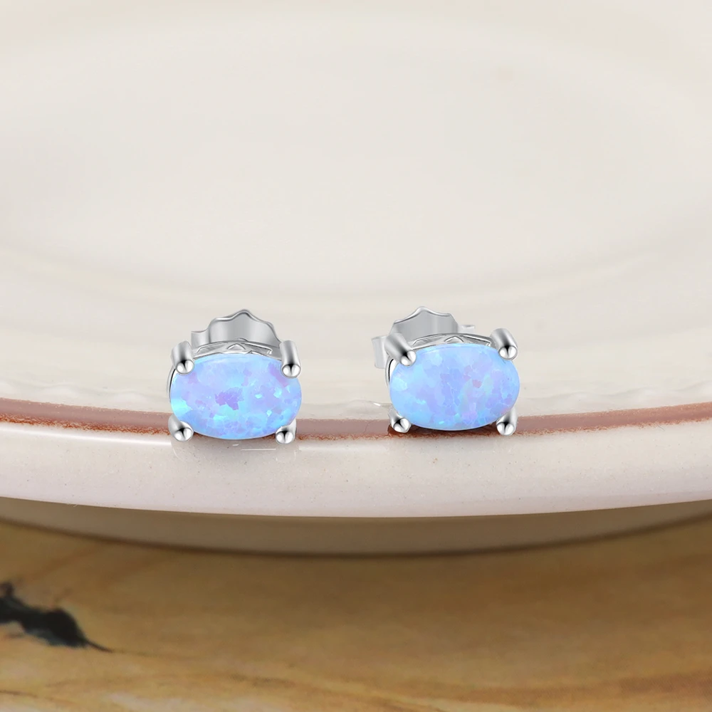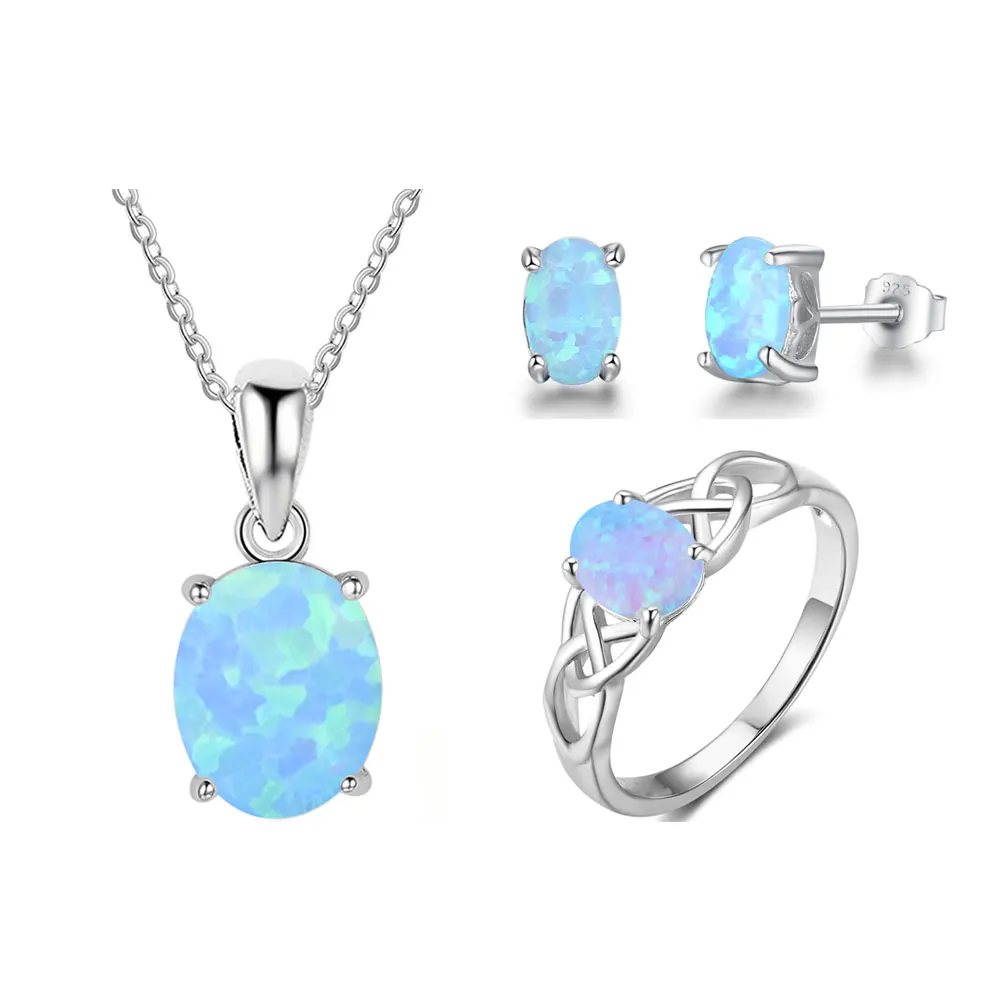 Ювелирные наборы для женщин Серебряные кольца цепочка ожерелья серьги синий овальный опал ювелирные изделия подарок для влюбленных (Lam Hub Fong)