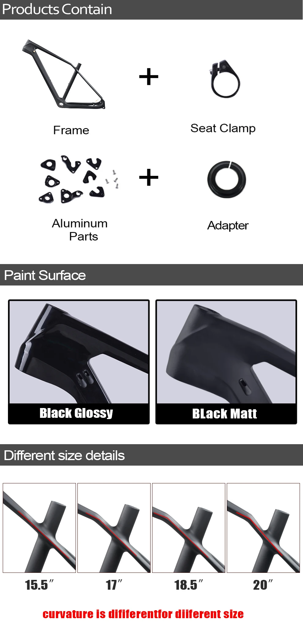 Название бренда: BXTМодель: BXT-MTB-036Название продукта: рама для горного велосипеда из углеродного волокна 27,5 ERОтделка: глянцевая/матоваяВ наличии Размеры: 15,5 Дюймов, 17 дюймов, 18,5 дюймов, 20 дюймовBB:BSAИзделие содержит: каркас + зажим сиденья + алюминиевые деталиТормозная система: дисковый тормозЕсли вам нужны пользовательские цвета или нет логотипа, пожалуйста, свяжитесь с нами.Если вы хотите купить заднюю ось 142*12 мм или гарнитуру, пожалуйста, обратитесь в службу поддержки клиентов