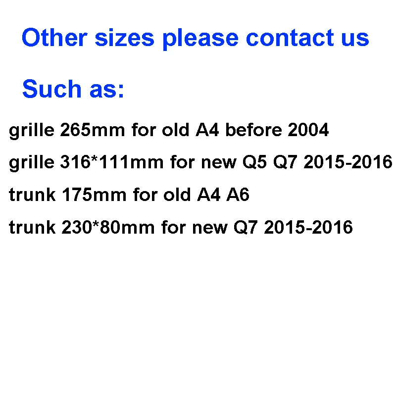Материал: АБС-пластик высшего качества Особенность: 3D дизайн, отличное качество, устойчивость к ржавчине и водонепроницаемость, никогда не выцветает Размер: как на выбор артикула Цвета: глянцевый черный, хромированный серебристый, матовый черный Подходящее место: (4 кольца) Средняя передняя решетка/средняя наклейка на багажник Комплектация: 1 шт. Пожалуйста, измерьте свой автомобиль перед заказом. 1. Решетка 273x95 мм для А3 А4 А5 и т. Д. 2. Решетка радиатора 281x96 для нового A6 A7 A8 с 2016 года и по настоящее время 3. Решетка 285x99 мм для Q3 Q5 Q7, A6 A7 до 2015 года и решетка с Сотами серии RS 4. Наклейка на багажник 192x66 мм для A4L TT (так как это наклейка может использоваться на любом автомобиле, кроме A5, A7 который находится с дугой.) 5. Наклейка на багажник 215x70 мм для старого Q7 A6L (так как это наклейка может использоваться на любом автомобиле, кроме A5, A7 который находится с дугой.) 6. Наклейка на багажник 203x72 мм с дугой специально для A5 A7 с оригинальной дугой (возможно, также подходит для других моделей, пожалуйста, проверьте самостоятельно) Другие размеры, пожалуйста, свяжитесь с нами, например: Решетка 265 мм для старого формата А4 до 2004 Решетка 316*111 мм для new Q5 Q7 2015-2016 Багажник 175 мм для старого формата А4 А6 Багажник 230*80 мм на новый Q7 2015-2016 Примечание: Пожалуйста, не оставляйте фотографии в Раздел «Комментарии». Спасибо!