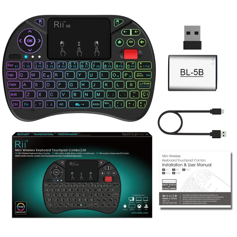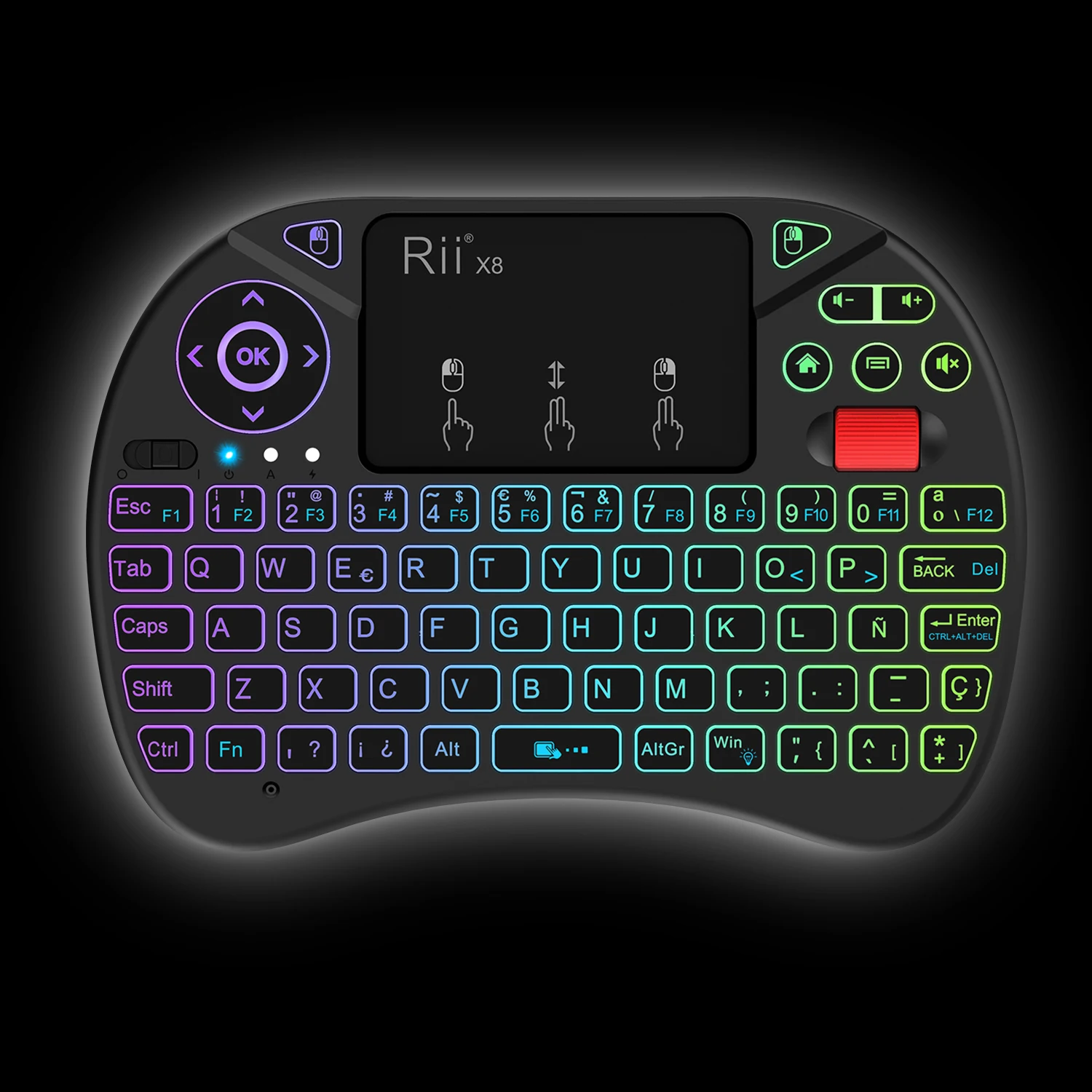 Оригинальная Беспроводная испанская мини-клавиатура Rii X8 2,4 ГГц с тачпадом, сменная цветная светодиодная подсветка, литий-ионная батарея для ТВ