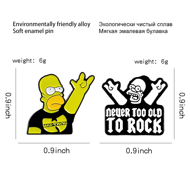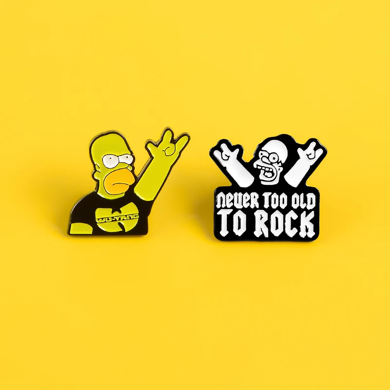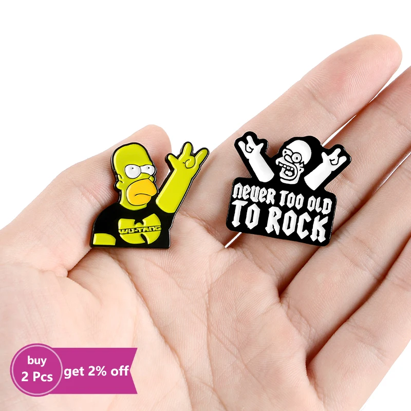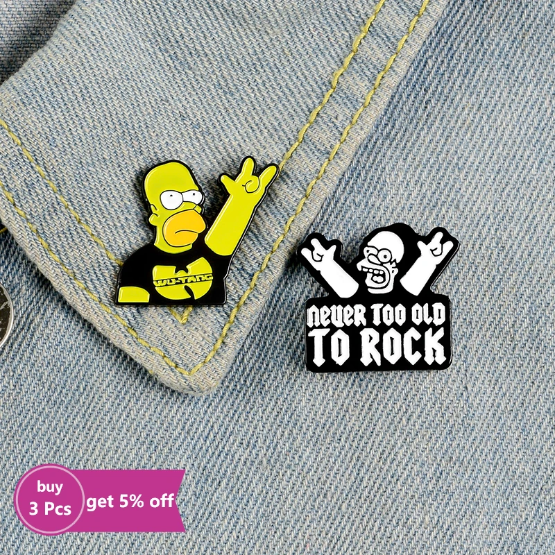 Эмалированная булавка NEVER TOO OLD TO ROCK, брошь в стиле рок-н-ролл, брошь Симпсона на рубашку, на лацкан, смешной значок, мультяшная бижутерия, подарок для друзей