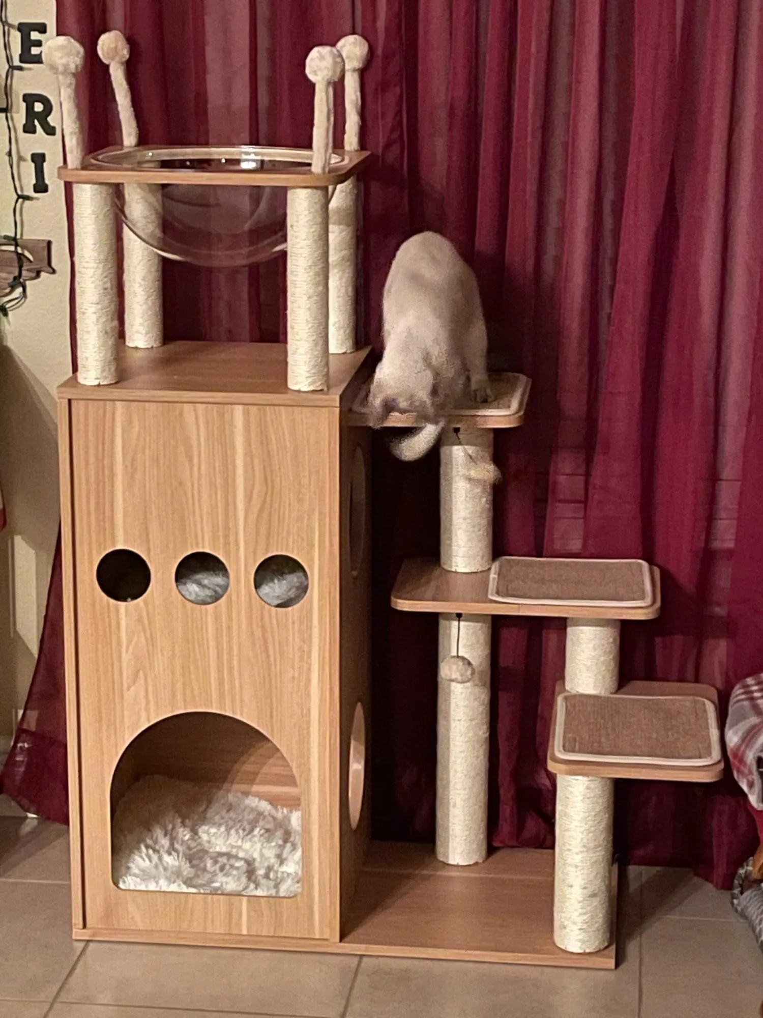 Получил быстро, легко построить, идеально подходит для маленькой кошки, большой кот может поместиться сверху, легкий и эстетичный :) рекомендую!