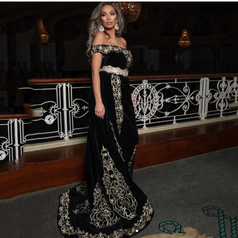 Женское длинное вечернее платье из велюра, с золотыми аппликациями