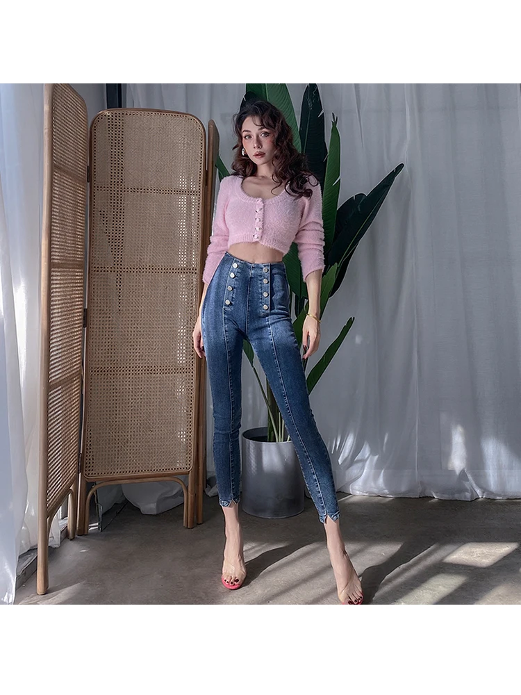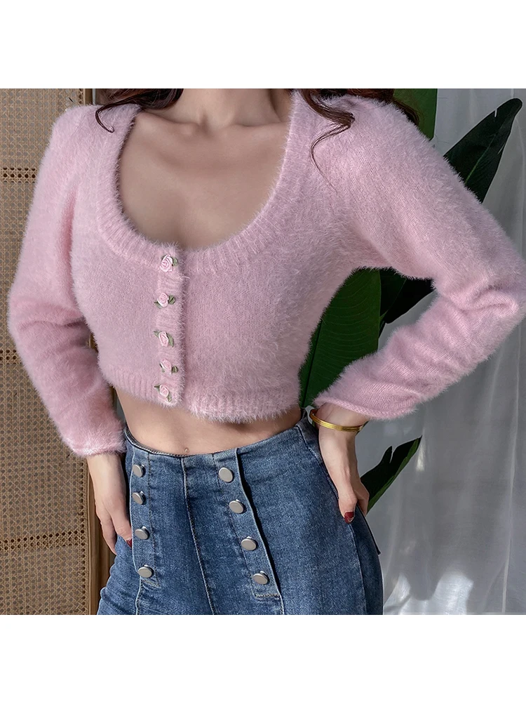 Женский винтажный Укороченный кардиган, розовый укороченный свитер с длинными рукавами-фонариками розы, зима 2020