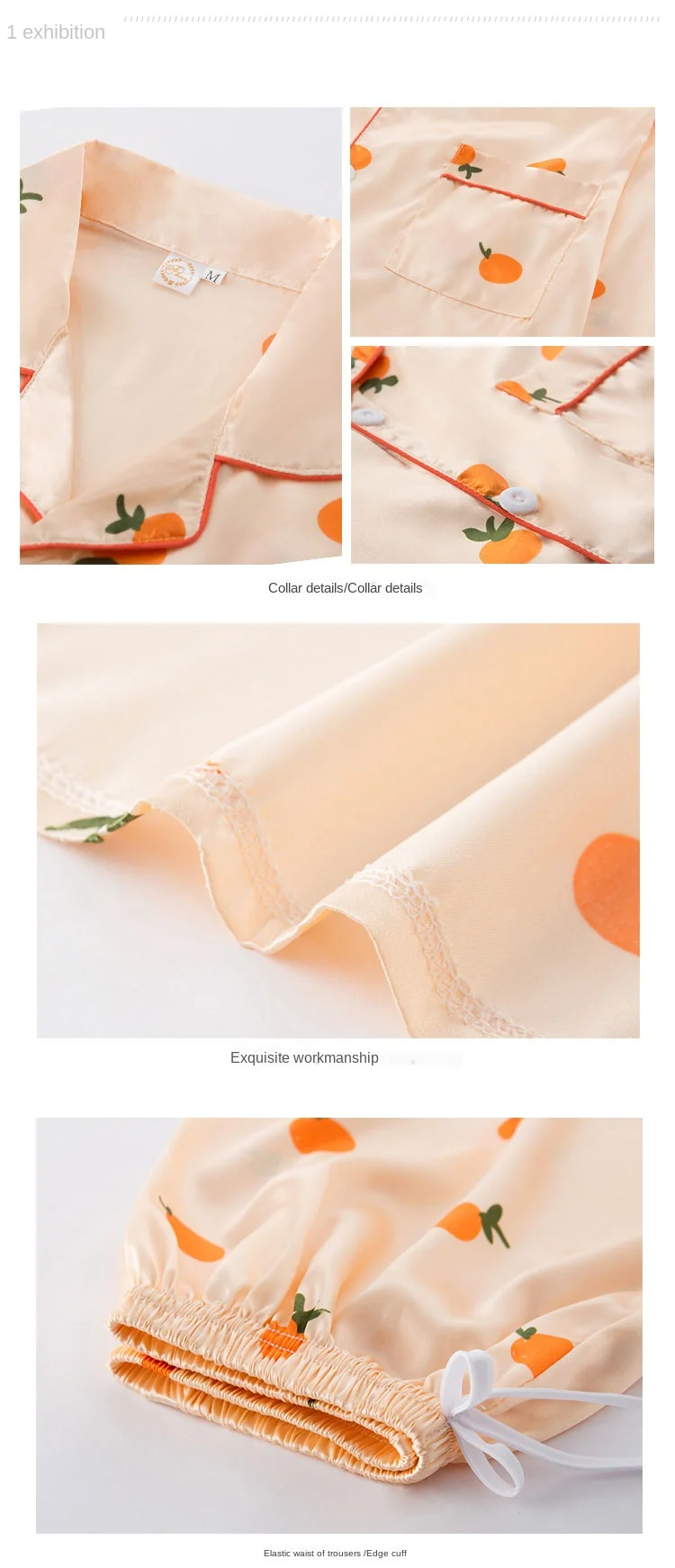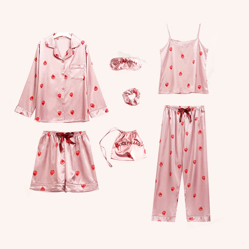 Women Pajamas Sets Spring Summer 7 Pcs Set Silk Print Shorts Long S...