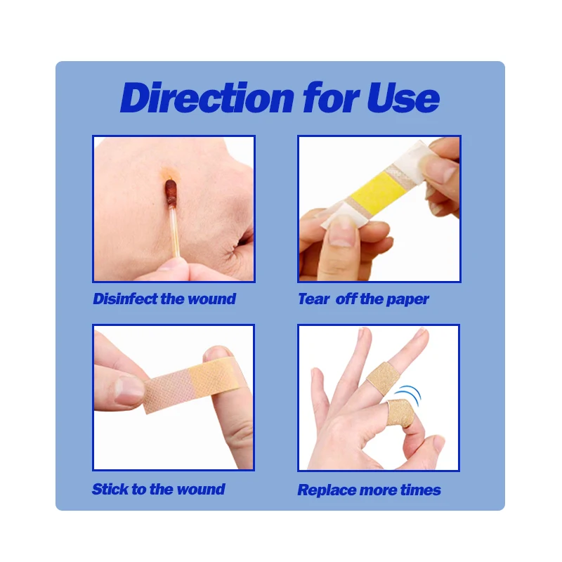 Использование:Откройте внешнюю посылка, откройте отдельный запечатанный бумажный пакет, потяните ленту-вспомогательную изоляционную бумагу с обеих сторон, наведите приподнятую часть посередине повязки на очищенную рану, нанесите ленту на кожу и прижмите край переплета.